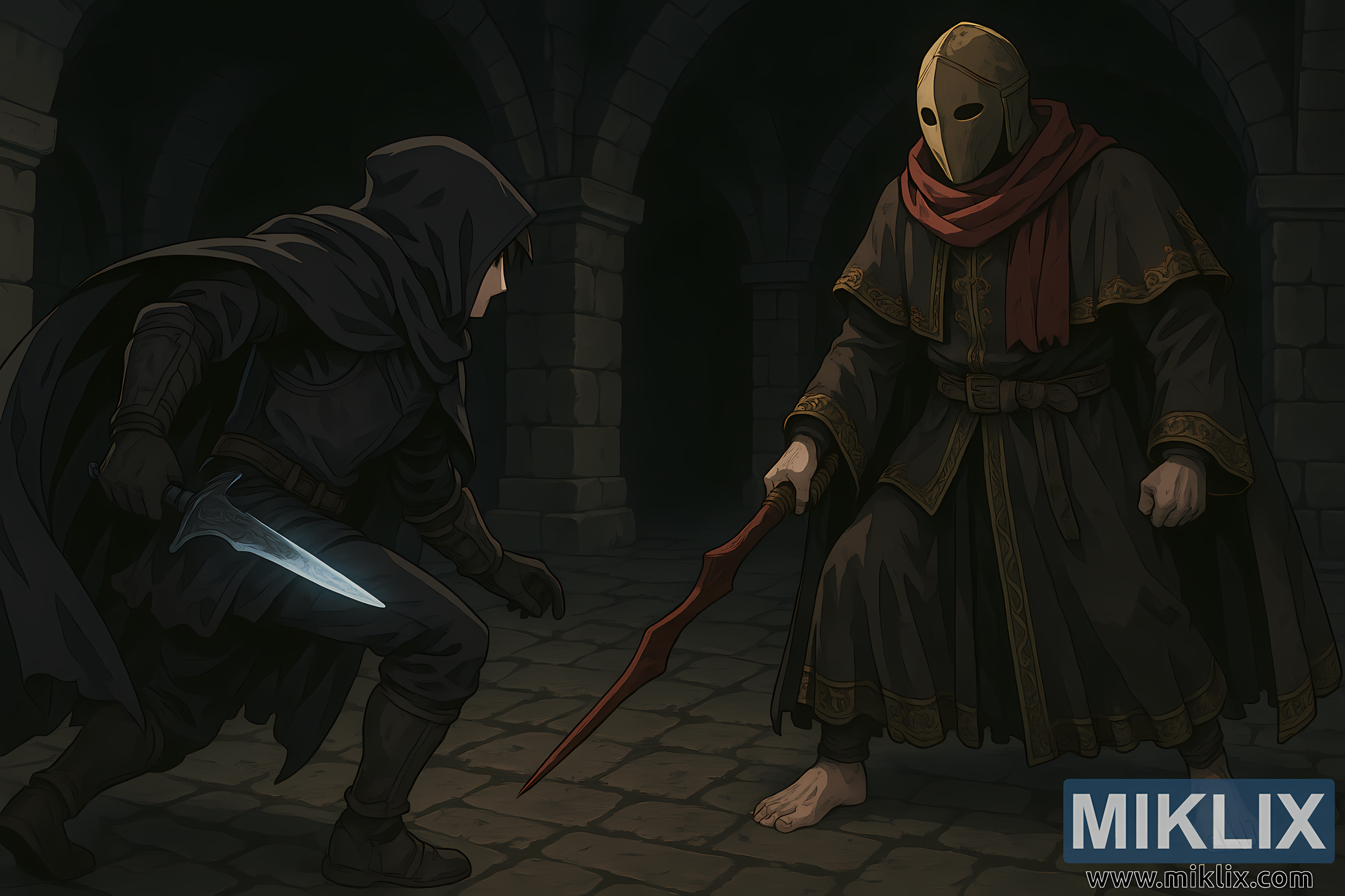 The environment amplifies the tension. Heavy stone arches rise behind the characters, fading into darkness as they recede. The walls and floor are aged, cracked, and uneven, implying centuries of decay and forgotten bloodshed. Lighting is sparse and directional, creating deep shadows and emphasizing silhouettes rather than details. There is no visible blood or active violence; instead, the mood is defined by stillness, anticipation, and the unspoken certainty of an imminent clash.