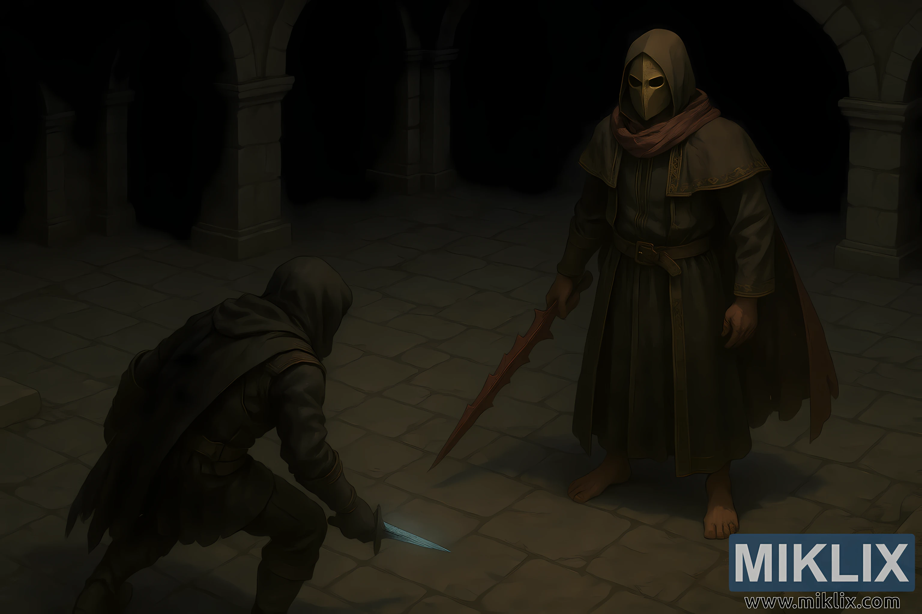 The environment reinforces the grim atmosphere. Thick stone pillars and rounded arches line the background, receding into shadow and darkness. The dungeon floor is composed of large, worn stone tiles, uneven and cracked, bearing the marks of age and neglect. Lighting is minimal and naturalistic, with soft highlights and deep shadows creating a heavy, suffocating mood.