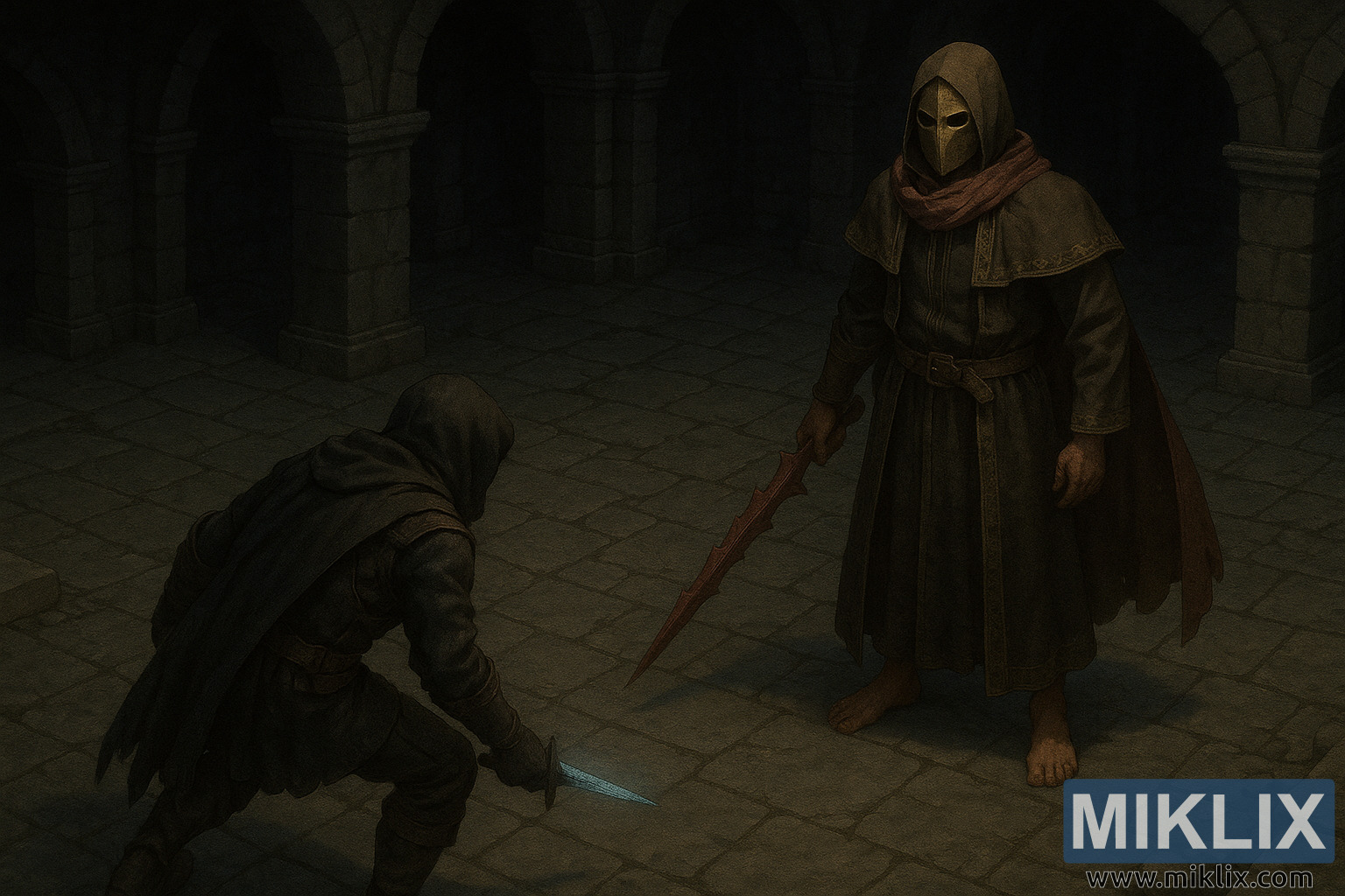 Across the open dungeon floor stands the Sanguine Noble, positioned slightly higher in the frame. The Noble’s stance is upright and composed, projecting confidence and ritualistic menace. Flowing robes in deep brown and near-black tones hang heavily from the figure, detailed with restrained gold embroidery along the trim and shoulders. A dark red scarf wraps around the neck and shoulders, adding a subdued but ominous accent of color. The Noble’s face is fully concealed by a rigid, gold-toned mask with narrow eye slits, erasing all trace of humanity and giving the impression of an impassive, ceremonial executioner.