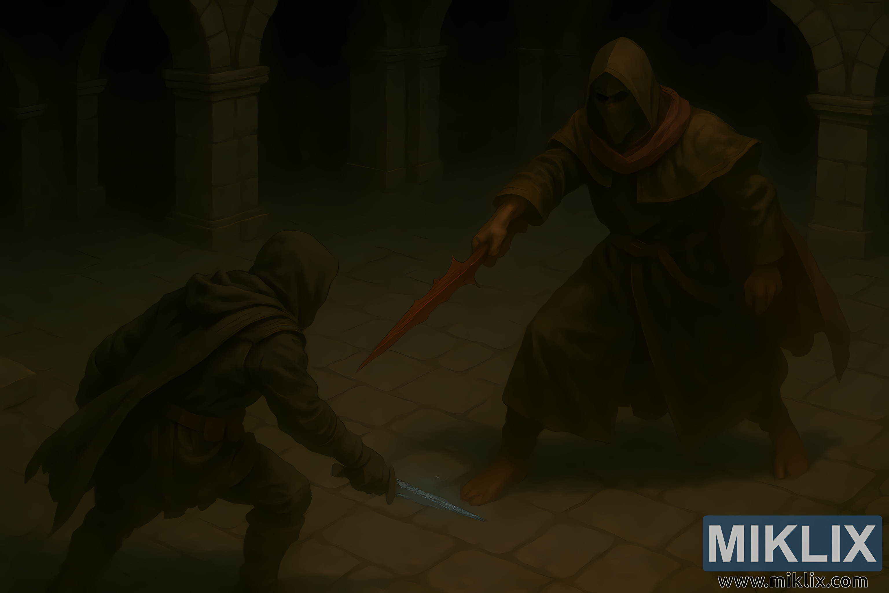 The environment heightens the sense of danger. Thick stone pillars and rounded arches loom in the background, dissolving into darkness as they recede. The dungeon floor is composed of uneven, cracked stone tiles, worn smooth by time and forgotten bloodshed. Lighting is minimal and directional, with deep shadows dominating the space and soft highlights catching only the most important forms. There is no excess gore; instead, motion blur, body language, and weapon angles convey violence and urgency.