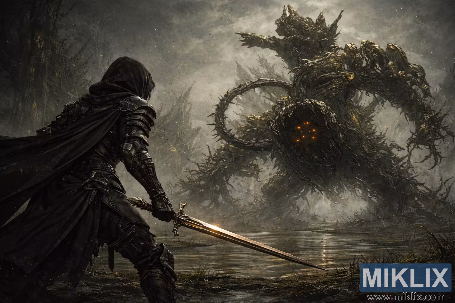 The environment enhances the realism and tension of the scene. The ground is a shallow, flooded swamp, with still water reflecting distorted images of both combatants. Mud, reeds, and broken roots protrude unevenly from the surface, hinting at treacherous footing. In the background, towering, decayed tree shapes fade into thick gray-green mist, giving the impression of immense scale and isolation. Fine particles and drifting debris move through the air, catching faint light and adding depth. The muted greens, browns, and grays dominate the scene, broken only by the warm glow of the sword and the Avatar’s core. The image captures a breathless pause, grounded and ominous, where both figures stand on the edge of violence and the world seems to hold its breath before the inevitable clash.