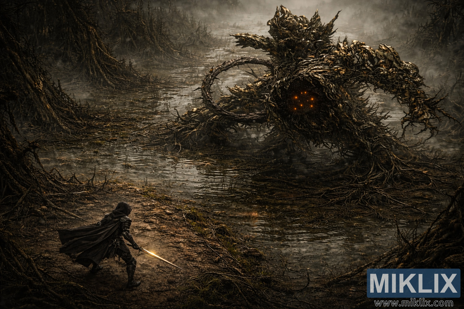 The environment amplifies the sense of danger and scale. The battlefield is a broad, waterlogged expanse filled with stagnant pools, exposed roots, and broken branches. From the isometric angle, the ground’s unevenness is clearly visible, with narrow strips of mud, shallow channels of water, and tangled root systems creating natural obstacles. Reflections ripple faintly on the water’s surface, distorting the silhouettes of both figures. In the background, massive, decayed tree structures and root walls fade into dense gray-green fog, suggesting an immense, dying forest stretching far beyond the immediate confrontation.