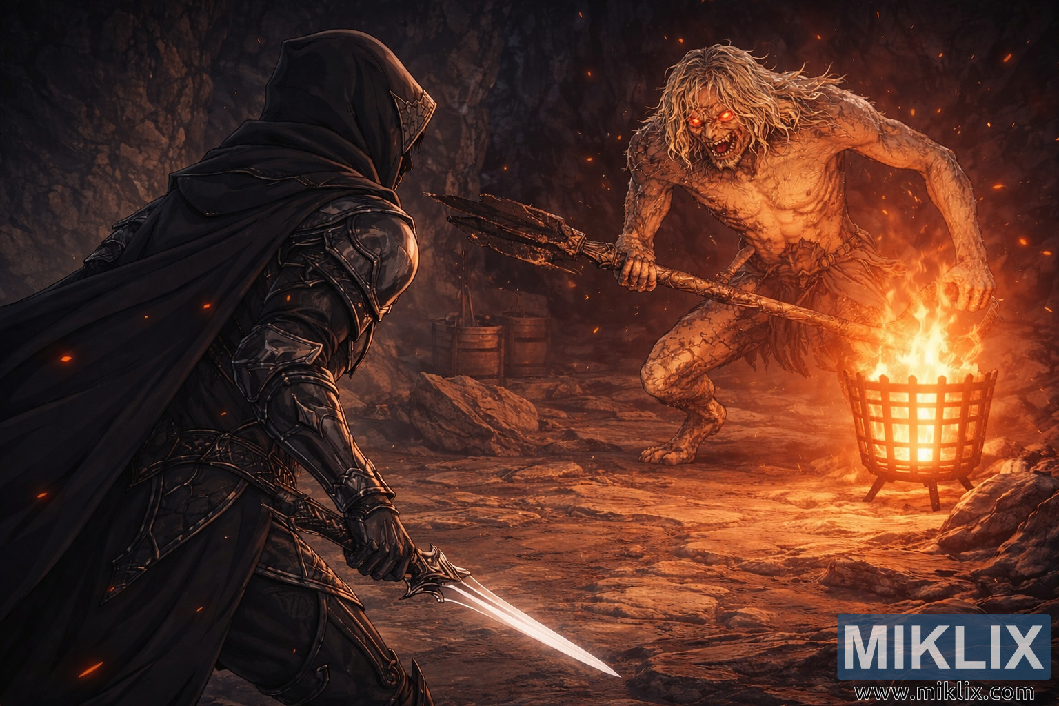 Dominating the mid-ground and right side of the composition stands the Scaly Misbegotten boss, rendered significantly larger than the Tarnished to convey overwhelming strength and monstrous intimidation. The creature’s hunched posture, elongated limbs, and heavily textured skin display a blend of rough human musculature and faint reptilian scaling. Wild strands of pale, tangled hair spill around its snarling face, exposing jagged teeth and glowing eyes that burn with fiery intensity. It grips a crude, oversized weapon in both hands, its worn metal edges and splintered handle highlighted by the bright orange glow of a nearby brazier. The brazier burns intensely, flames curling upward and casting dynamic, flickering light that dances across the cave walls, illuminating the Misbegotten’s torso while throwing deep shadows behind it. Floating embers drift through the smoky air, adding a sense of motion and heat to the otherwise frozen moment.