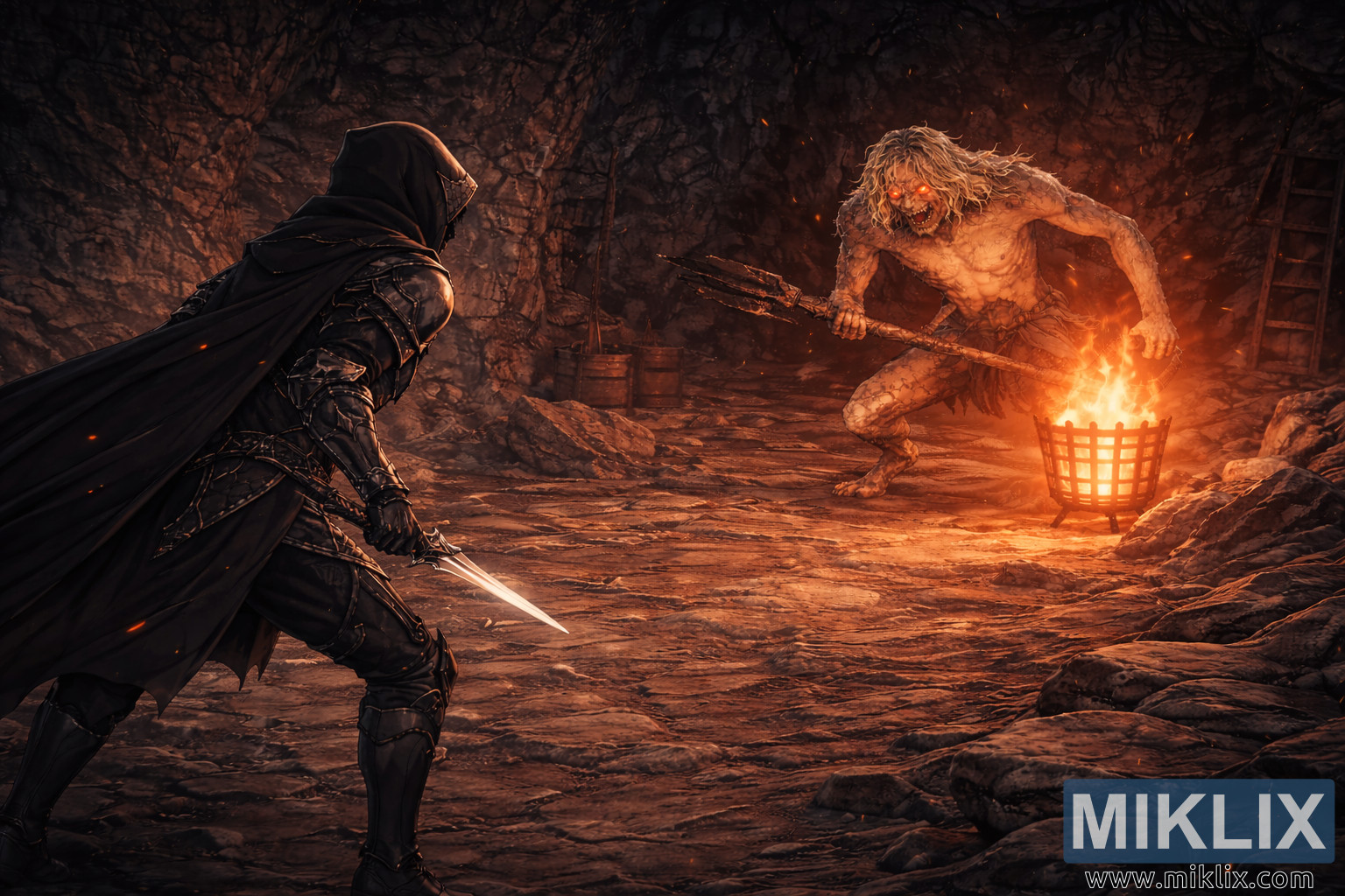Across the mid-ground on the right side towers the Scaly Misbegotten boss, rendered at a scale that visually dwarfs the Tarnished and emphasizes overwhelming physical dominance. Its hunched posture, elongated limbs, and heavily textured skin combine sinewy human musculature with faint reptilian scaling. Wild strands of pale hair frame a snarling face filled with jagged teeth and glowing ember-like eyes that radiate menace. The creature grips a crude oversized weapon with both hands, the worn metal edges and splintered wooden shaft sharply illuminated by the blazing brazier beside it. The brazier’s flames curl upward in vivid orange and gold hues, sending sparks drifting into the smoky air and casting dynamic, flickering shadows across the cavern walls. This warm light envelops the Misbegotten’s torso while leaving parts of its limbs in darkness, enhancing its monstrous silhouette.