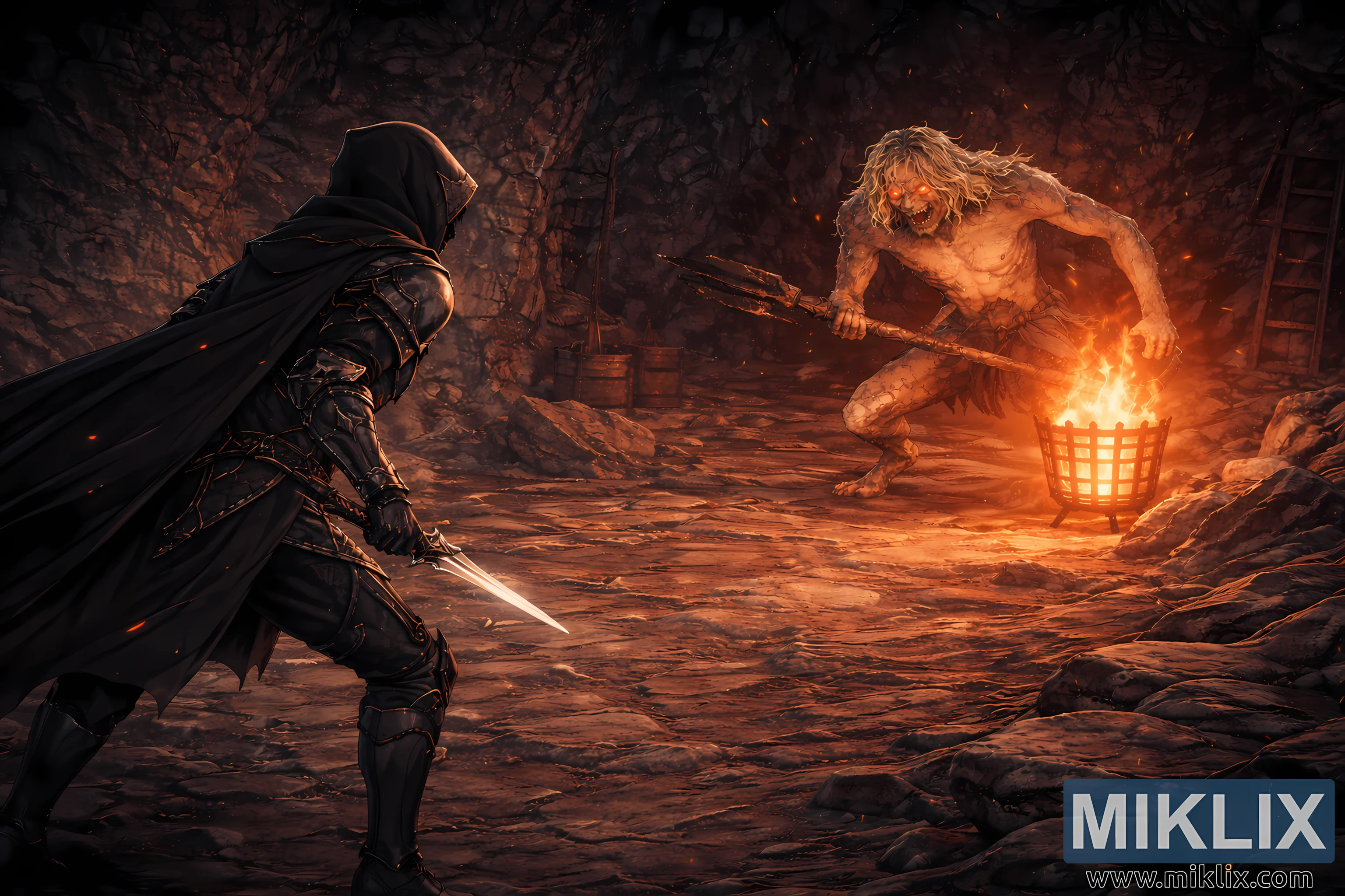 With the camera drawn farther back, the surrounding environment becomes a significant storytelling element. Rugged stone textures line the tunnel walls, scattered rocks and uneven ground stretch across the foreground, and abandoned barrels, wooden supports, and a partially visible ladder hint at the tunnel’s long-forgotten mining past. The expanded background reveals deeper recesses of shadow and layered rock formations, adding depth and atmosphere to the underground setting. Lighting plays a crucial symbolic role: cool bluish tones envelop the Tarnished’s side of the cave while fiery amber and orange hues dominate the Misbegotten’s territory, visually reinforcing the thematic clash between silent precision and raw ferocity. The open space between the two figures becomes the emotional focal point, charged with anticipation as both adversaries cautiously measure each other in silence. Fine anime linework, layered shading, and high-definition textures combine to create a richly immersive tableau that captures the breathless instant before violence erupts, blending elegance, dread, and cinematic grandeur into a single expansive visual narrative.
