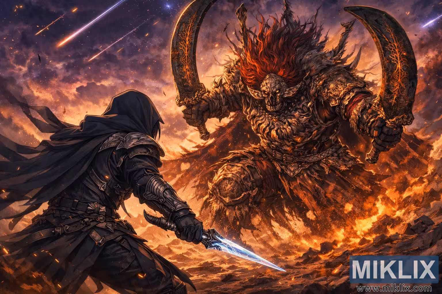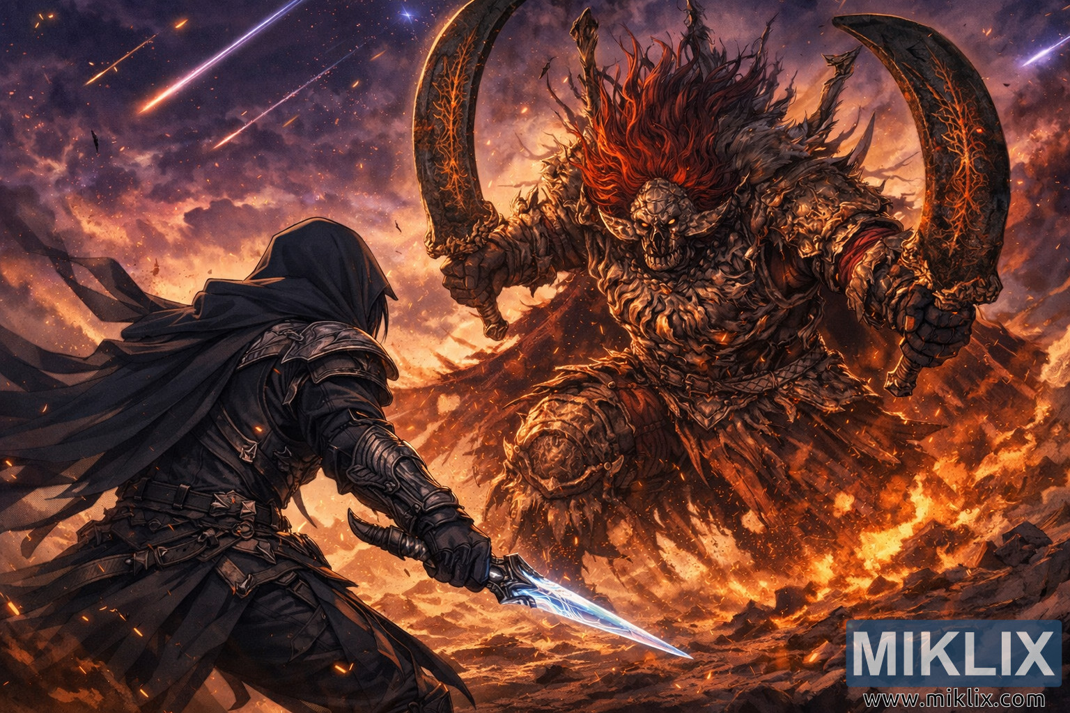 Despite the overwhelming scale of Radahn, the Tarnished stands resolute. Their slightly crouched stance and the tension in their shoulders convey a moment of absolute focus before the strike, as if the world has narrowed to the space between dagger tip and giant foe. The lighting unites the two figures: cool blue highlights from the Tarnished’s blade trace the edges of their armor, while fiery orange light from Radahn and the burning ground sculpts the giant’s form, emphasizing the imbalance of power yet also the inevitability of confrontation. The entire composition reads like a frozen frame from an epic anime battle, charged with motion, heat, and destiny.