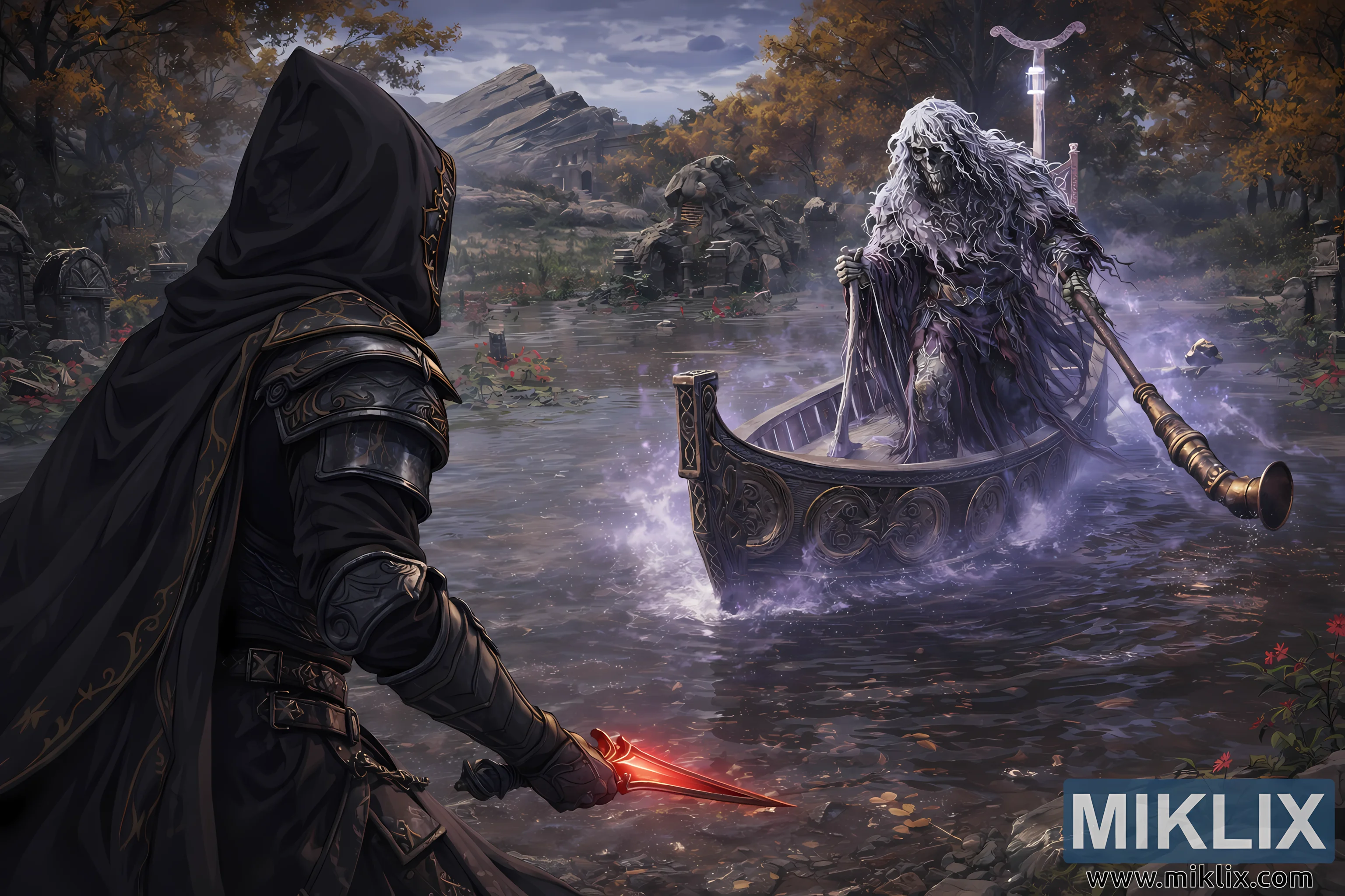 Across the flooded clearing, occupying the center-right of the frame, the eerie skeletal mariner rises from a narrow wooden boat that appears to glide unnaturally over the swamp’s surface. The figure is wrapped in ragged violet and gray robes that fray into mist at the edges, suggesting an otherworldly presence. Long, tangled white hair hangs over a skull-like visage, and faint pale light glows within hollow eye sockets. The mariner grips an elongated oar shaped like a ceremonial staff, its metallic end catching a cold highlight. A subtle aura of purple energy radiates around the boat, disturbing the water with luminous ripples and ghostly splashes that break the stillness of the scene.
