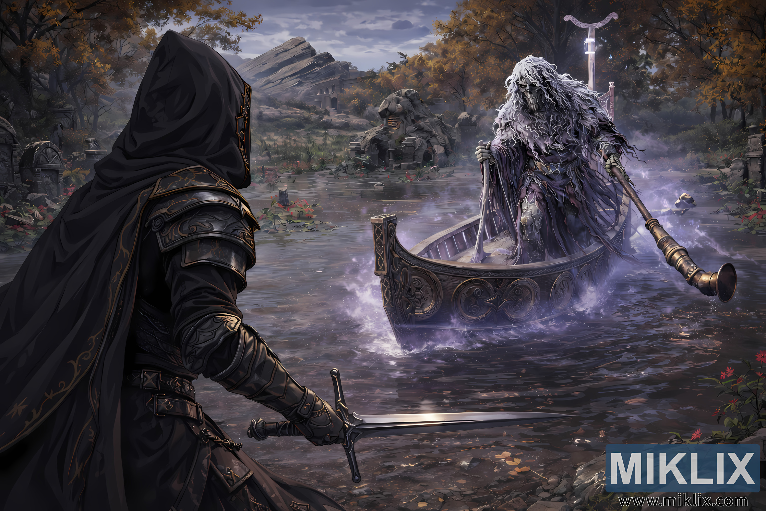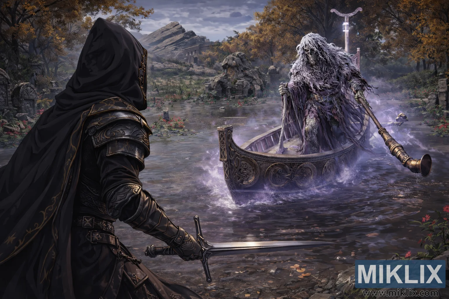 Across the shallow water near the center-right of the frame stands the eerie skeletal mariner, rising from a narrow wooden boat that appears to glide unnaturally over the swamp’s surface. The figure is draped in ragged robes tinted with shades of violet and ashen gray, their edges dissolving into wisps of spectral mist. Long, tangled white hair cascades around a skull-like face whose hollow eye sockets glow faintly with pale luminescence. The mariner grips an elongated oar shaped like a ceremonial staff, its metal tip catching faint highlights as a subtle purple aura radiates around the boat. This supernatural glow disturbs the water, creating luminous ripples and gentle splashes that break the otherwise still surface.