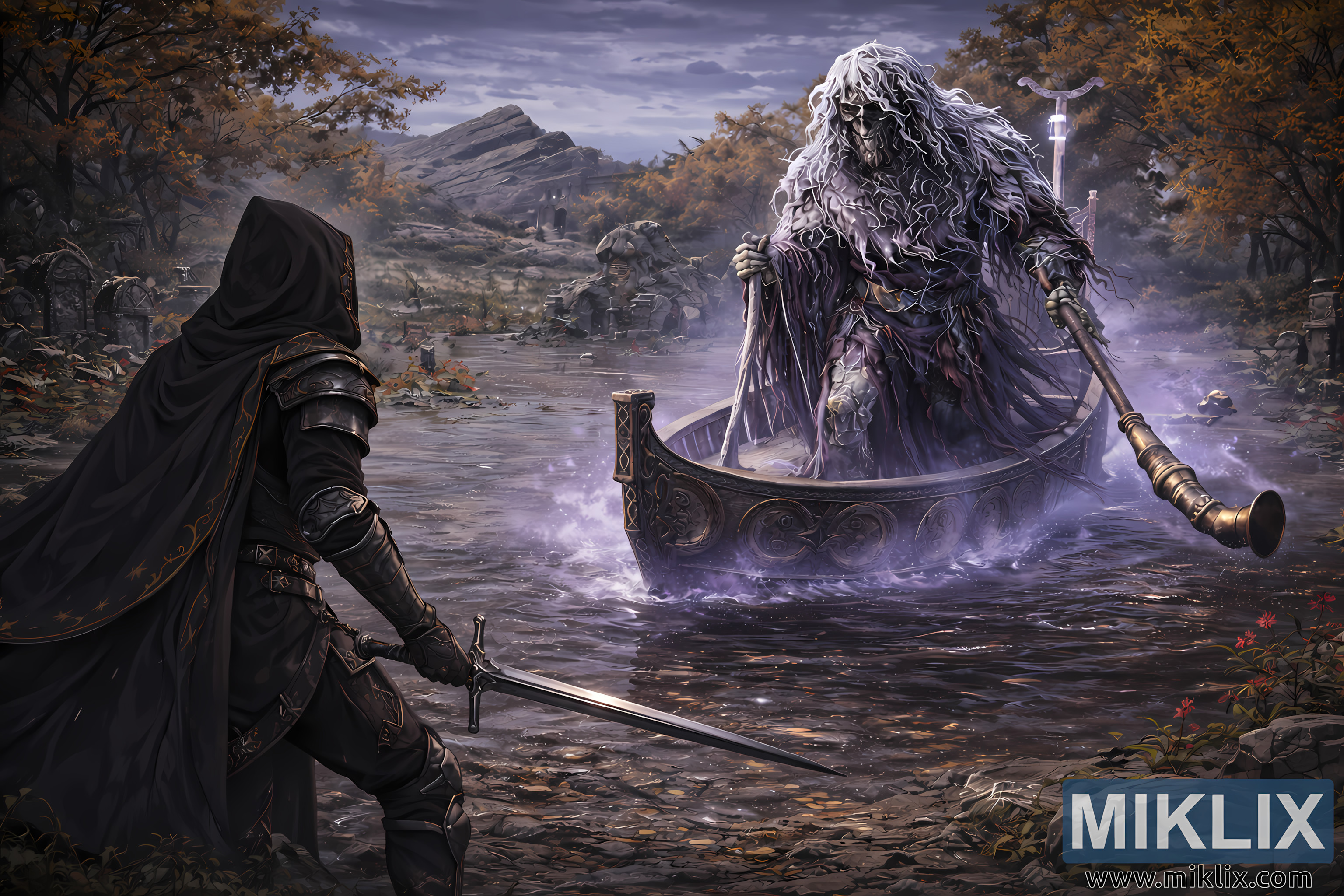 Dominating the mid-right and center of the frame is the skeletal mariner boss, now towering in scale and presence. The enlarged figure rises from a narrow, ornate wooden boat that appears to glide unnaturally across the shallow swamp. Its robes hang in ragged, layered sheets tinted with muted violet and gray, dissolving at the edges into drifting spectral mist. Long strands of tangled white hair cascade over a skull-like face whose hollow eye sockets glow faintly with pale luminescence. The mariner grips an elongated oar shaped like a ceremonial staff, its metallic end catching cold highlights that contrast with the soft ambient light. A subtle purple aura radiates from the boat and the figure’s lower robes, disturbing the water with luminous ripples and gentle splashes that spread outward in concentric circles, visually reinforcing the boss’s supernatural weight and scale.