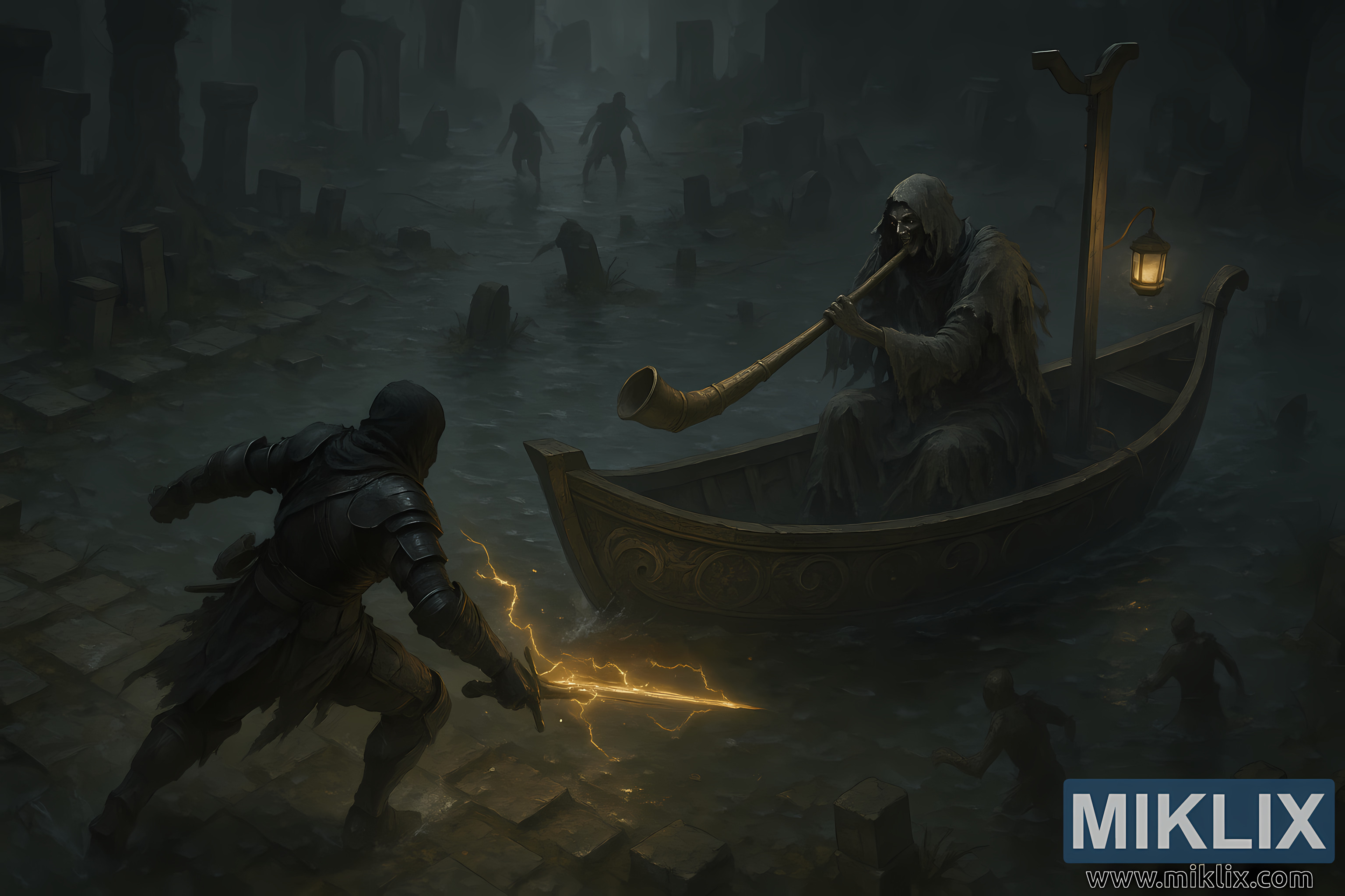 The environment reinforces the sense of danger and motion. Broken gravestones jut from the water at irregular angles, forming a treacherous battlefield. Crumbling stone paths and toppled arches are half-submerged, guiding the eye deeper into the scene. In the midground and background, undead figures wade forward through the murky water, their silhouettes distorted by mist and distance. They appear closer and more threatening than before, suggesting the Mariner’s summoning is already taking effect.