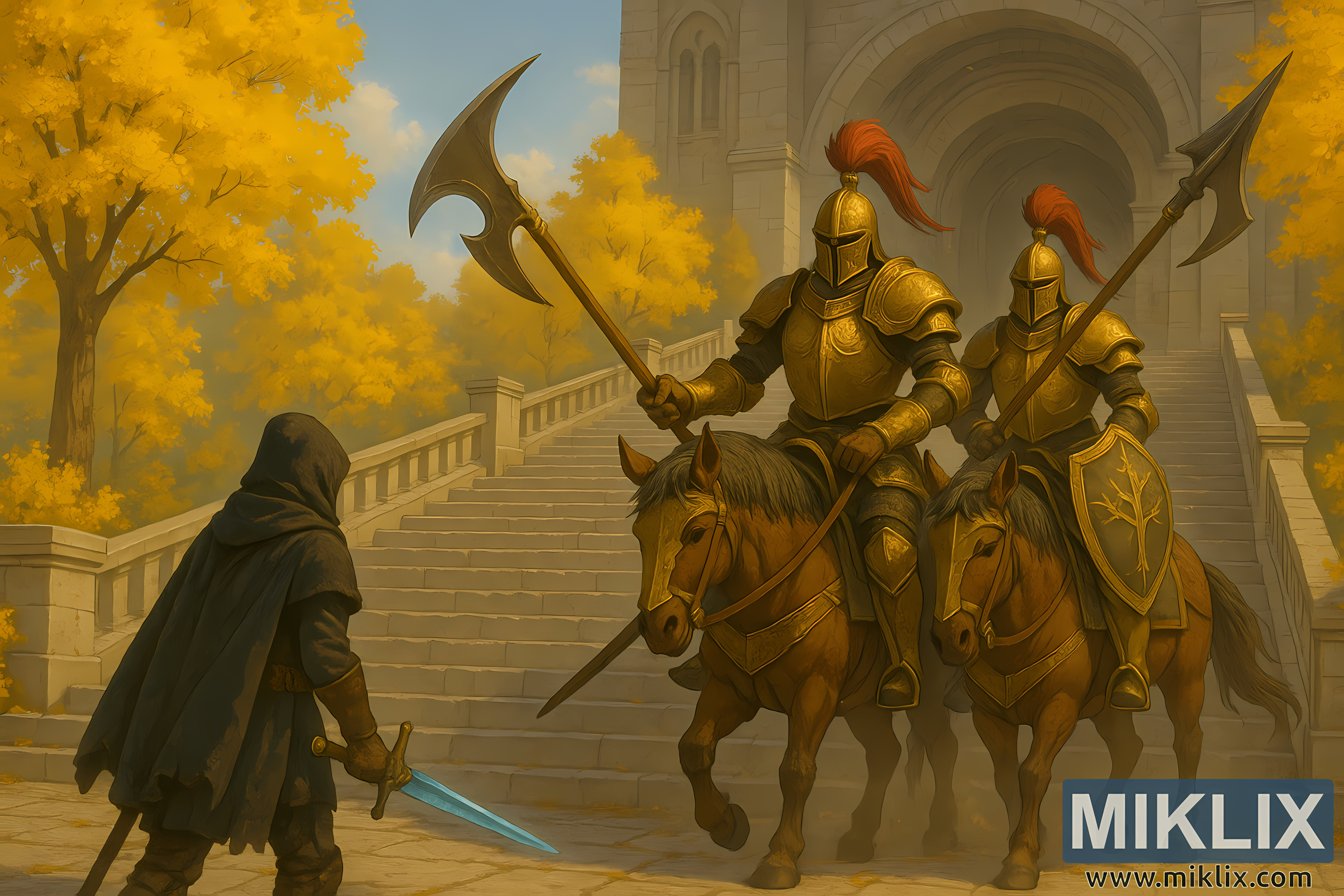 A detailed fantasy illustration of a lone Tarnished confronting two golden, halberd-wielding Tree Sentinels on horseback on the grand staircase to Leyndell Royal Capital in Elden Ring.