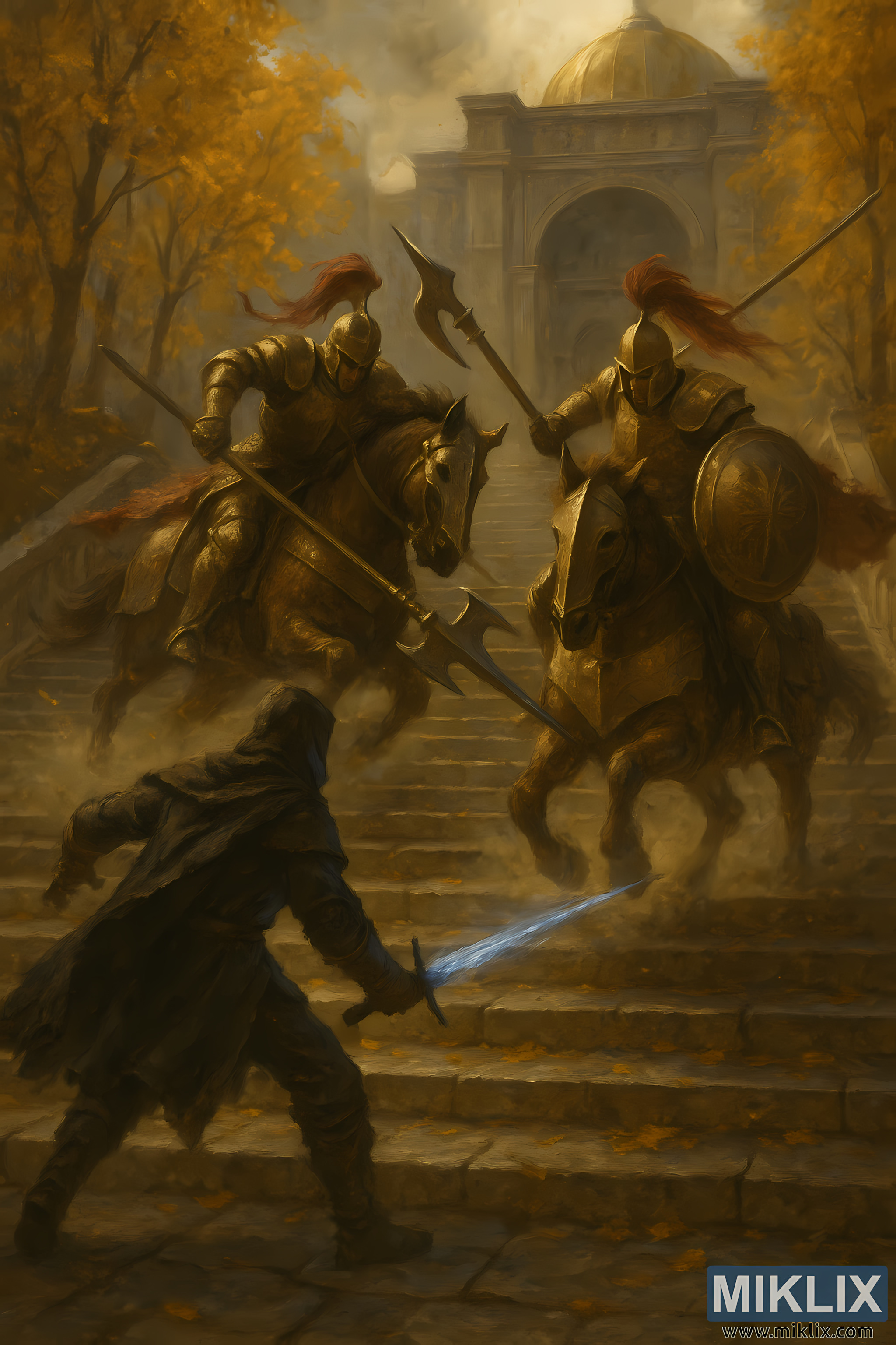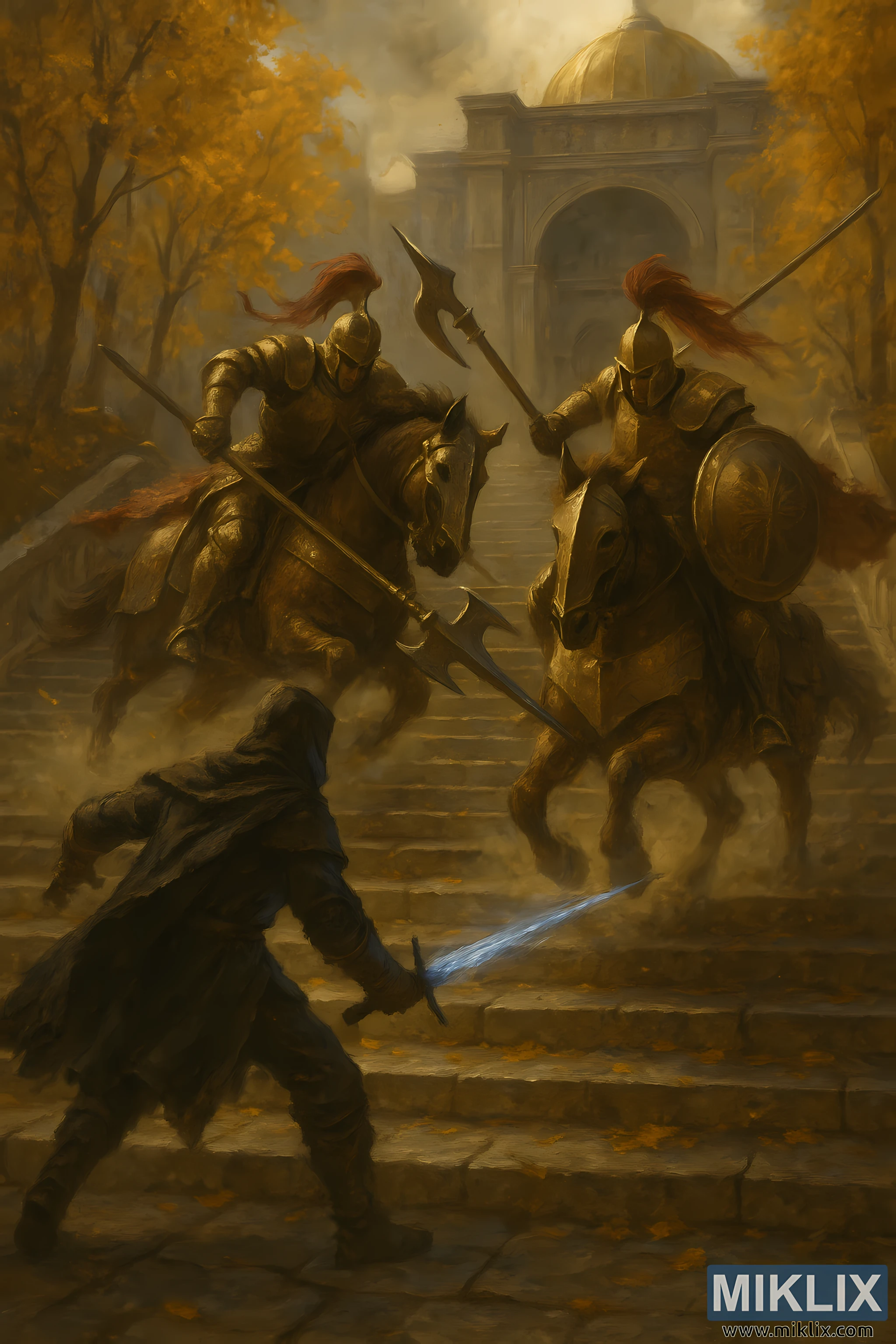 At the bottom of the frame, the Tarnished stands braced on the worn stone steps, body twisted in mid-stride as they prepare to meet the charge descending from above. Their dark, ragged armor absorbs the warm, muted light filtering through the golden autumn canopy. Cloak edges tear backward in the force of the wind kicked up by the descending warhorses. The Tarnished’s right arm is extended low, gripping a spectral blue sword that casts a faint, cold luminance over the surrounding stones. The weapon’s shimmering arc contrasts sharply with the otherwise earthy palette—its glow painting the underside of the Tarnished’s cloak and illuminating drifting dust in its path.