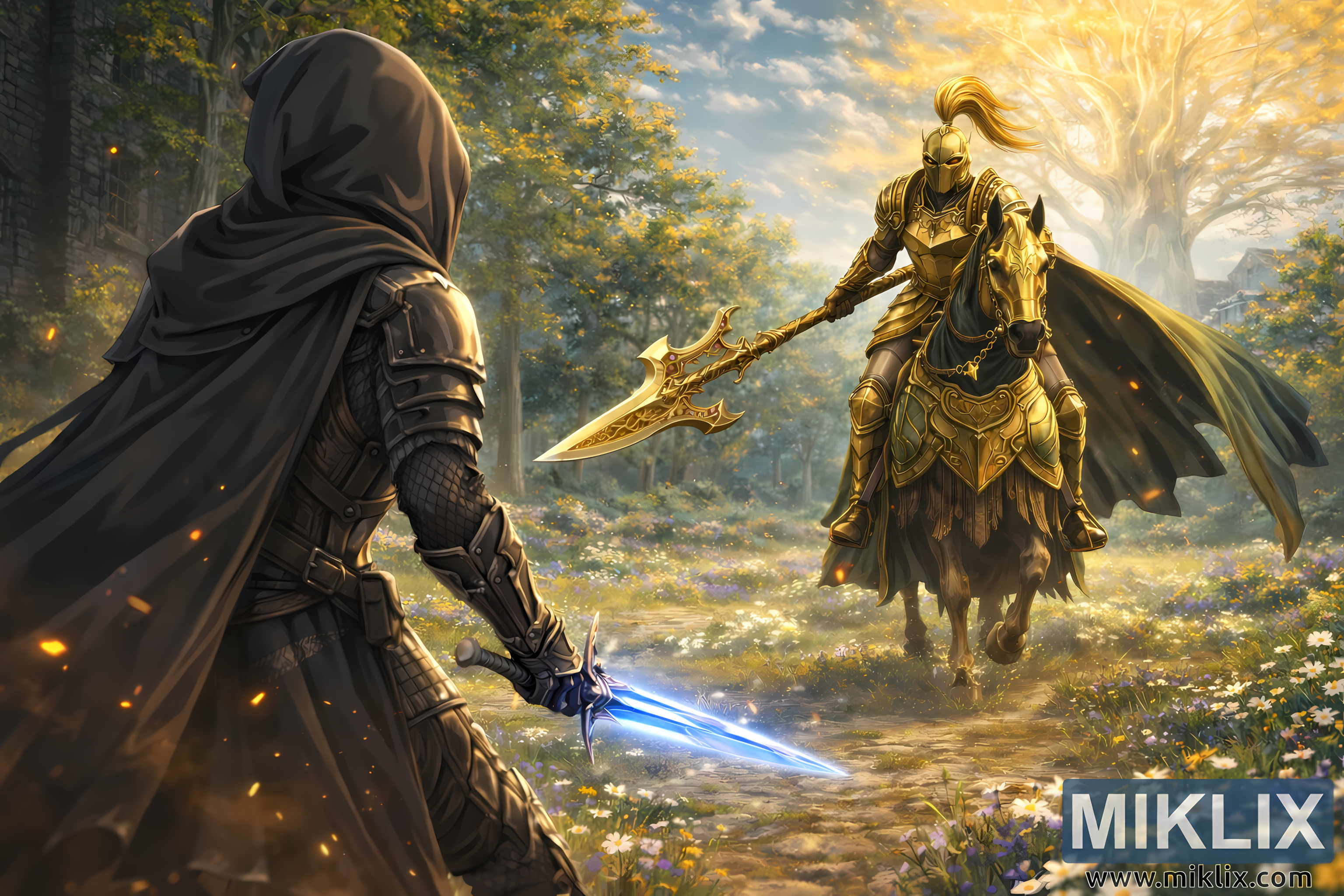 Opposite them, positioned to the right side of the frame and slightly farther back, is the Tree Sentinel boss mounted atop a massive, armored steed. The Tree Sentinel is clad in ornate golden armor, richly detailed with engraved patterns, heavy pauldrons, layered greaves, and a closed helm crowned with a flowing golden plume. The horse beneath it wears matching gilded barding, reinforcing the Sentinel’s imposing, regal presence. In its hands, the Tree Sentinel wields a large golden halberd inspired by the iconic in-game weapon, featuring a long shaft and an elaborate, crescent-shaped blade that gleams in the sunlight. The halberd is held diagonally across the Sentinel’s body, signaling readiness while maintaining the sense that combat has not yet begun.
