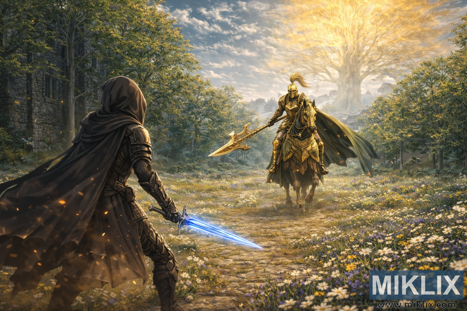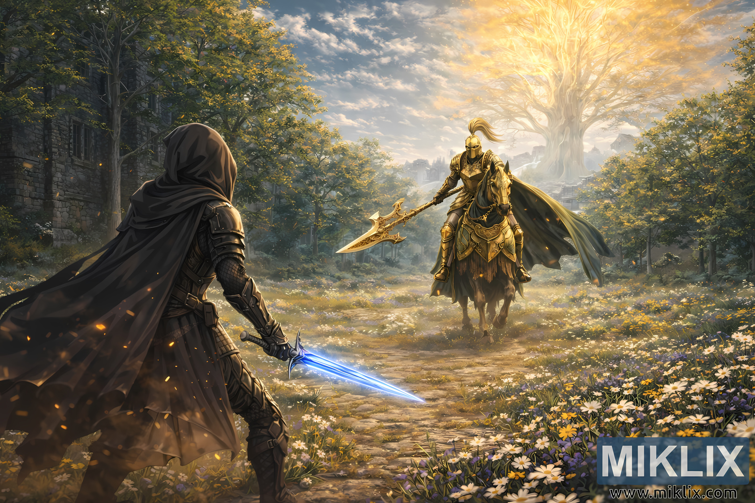 The environment is a lush Hinterland meadow filled with wildflowers in shades of white, yellow, and violet. Tall grass sways gently, and a faint dirt path runs between the two combatants, visually connecting them. Ancient stone ruins rise along the left side of the scene, partially overtaken by moss and trees, while dense green foliage frames the clearing. In the distance, the radiant Erdtree dominates the skyline, its massive golden branches glowing against a softly clouded sky and casting warm light across the landscape. The overall composition emphasizes scale, atmosphere, and tension, capturing the calm before the storm where both warriors stand fully aware of the imminent clash.