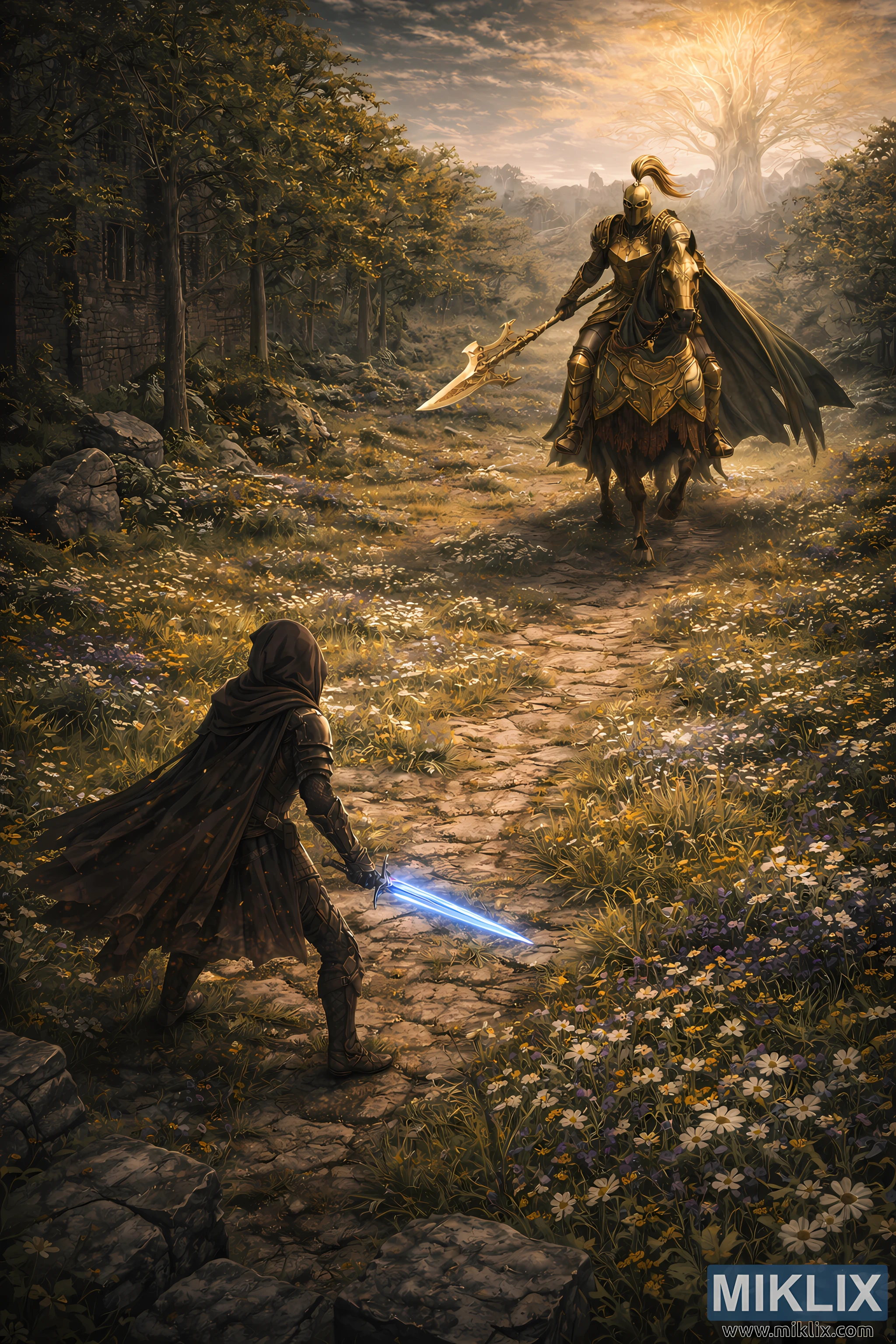 Semi-realistic isometric fan art from Elden Ring: Shadow of the Erdtree depicting the Tarnished confronting a massive Tree Sentinel with a golden halberd in a lush meadow beneath the Erdtree.