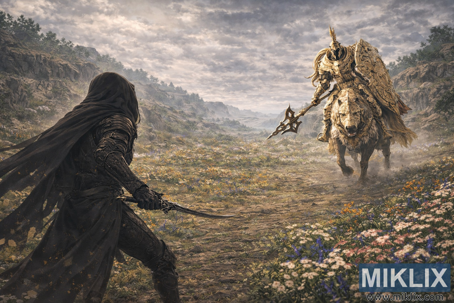 The expanded background adds depth and atmosphere to the scene. A winding dirt path cuts through a wide field of wildflowers in whites, yellows, purples, and blues, their softness contrasting with the violence implied by the standoff. Rocky outcroppings and rolling hills frame the valley, dotted with sparse trees that fade into a misty distance. Above, a heavy, cloud-filled sky stretches across the horizon, diffusing the light and bathing the scene in cool, subdued tones. The overall composition emphasizes scale and inevitability, capturing the fragile calm before the battlefield erupts into motion.