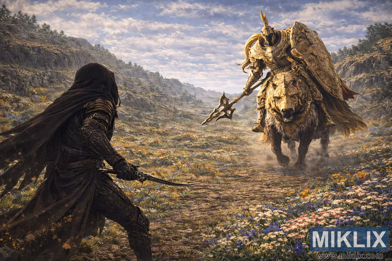 The environment enhances the realism and atmosphere of the scene. A narrow dirt path runs between the two figures, cutting through a wide field of wildflowers in whites, yellows, blues, and muted purples. The colors are natural and balanced, vivid enough to bring the landscape to life without overwhelming the scene. Rocky hills and uneven cliffs rise on both sides of the valley, dotted with sparse trees and scrub. In the distance, the terrain fades into mist, creating a strong sense of depth. Above, a partly clouded sky diffuses the sunlight, casting soft shadows and lending the scene a grounded, cinematic tone. The overall image captures the fragile calm before violence, emphasizing scale, tension, and inevitability.