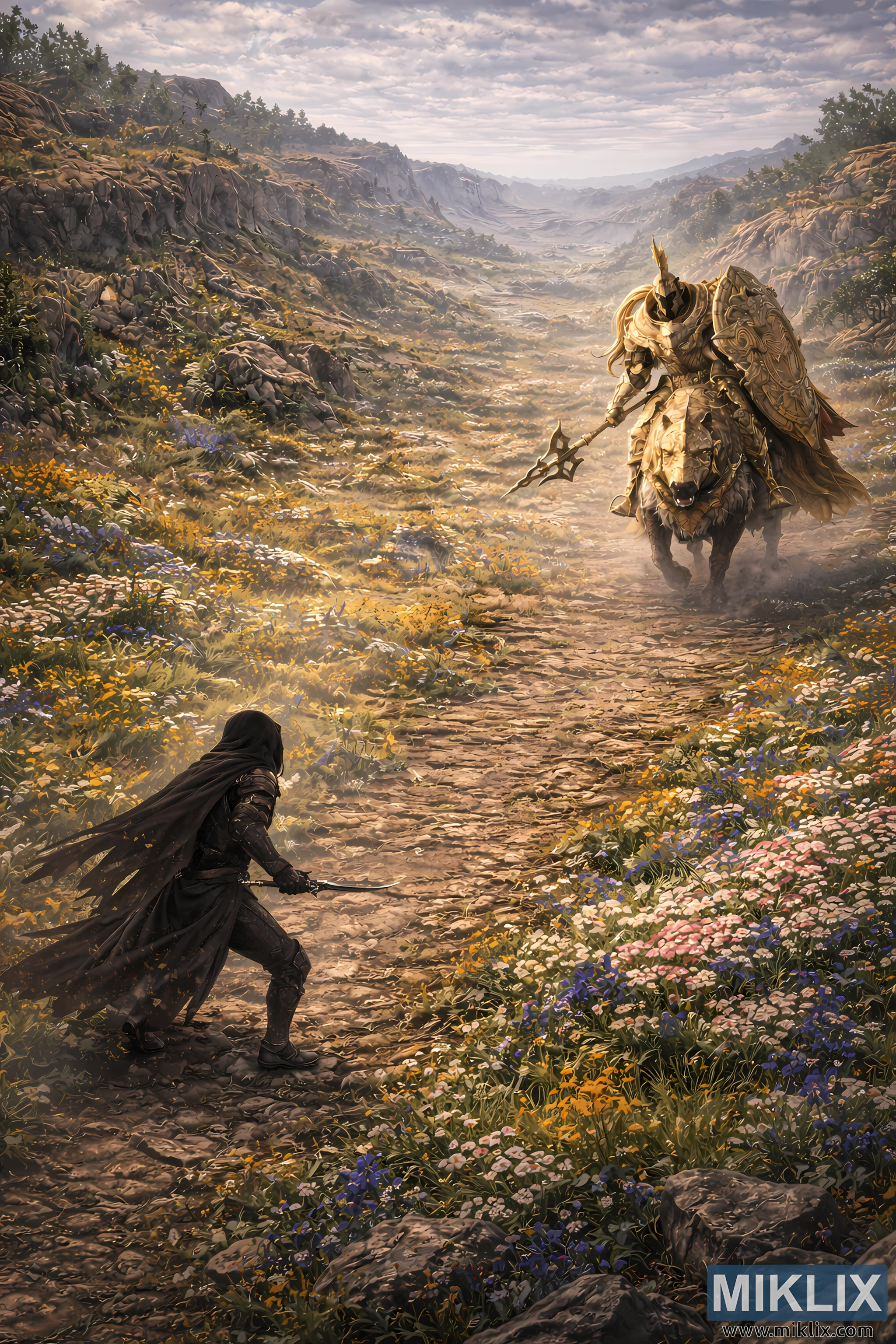 The expanded environment plays a central role in the composition. The dirt path winds through a wide valley carpeted with wildflowers in whites, yellows, blues, and muted purples. These natural colors are vivid yet grounded, adding life without overwhelming realism. Rocky cliffs and uneven hills flank both sides of the valley, dotted with sparse trees and low vegetation. In the far distance, the land recedes into a hazy horizon, creating a strong sense of depth and scale. Above, a cloud-filled sky stretches across the scene, diffusing the sunlight and casting soft, natural shadows. The isometric perspective reinforces the feeling of fate closing in, capturing the quiet, fragile stillness before the clash erupts.