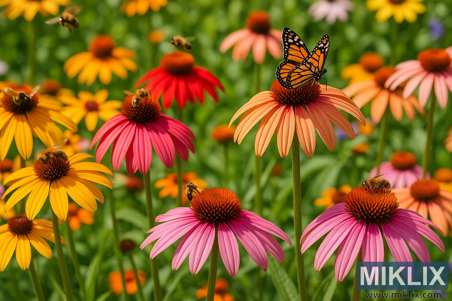 A lively summer garden scene with colorful Echinacea blooms—pink, orange, red, and yellow—teeming with bees and a butterfly, highlighting coneflowers as pollinator magnets in vivid sunlight.