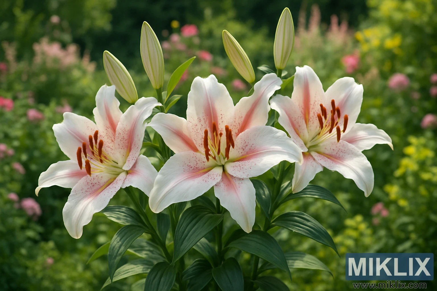 In the heart of a flourishing garden, a trio of Oriental lilies stands in radiant bloom, commanding attention with their elegant form and delicate coloration. These trumpet-shaped blossoms, large and luminous, seem to glow with an inner light as they unfurl their creamy white petals, each one kissed with gentle blushes of pink that deepen toward the center. The petals are not merely smooth surfaces—they are adorned with subtle speckles, tiny freckles of darker pigment that add depth and character to the flowers’ already captivating appearance. Their edges curve gracefully outward, creating a sense of motion and openness, as if the lilies are reaching toward the sun in quiet celebration.