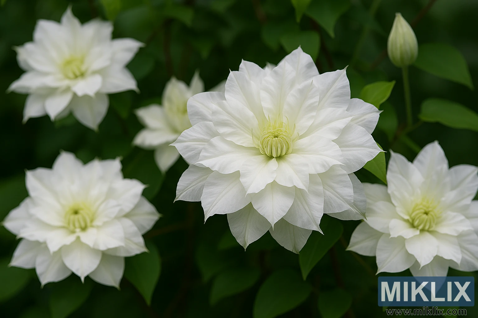 The image is a high-resolution, close-up photograph of Clematis ‘Duchess of Edinburgh’, one of the most refined and elegant varieties in the clematis family, known for its large, double-petaled white flowers. Captured in landscape orientation with exquisite clarity and realism, the photograph immerses the viewer in a garden scene that exudes timeless grace and natural beauty. The composition highlights a cluster of fully open blooms surrounded by lush green foliage, with the central flower commanding immediate attention due to its intricate structure and flawless detail.