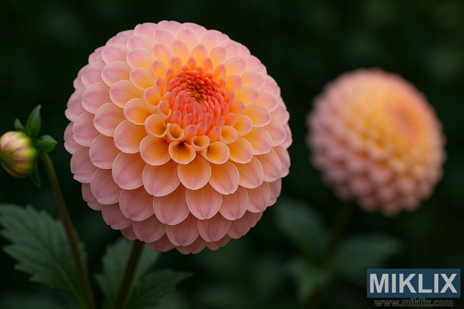 This image presents a luminous and photo-realistic close-up of a Jowey Winnie dahlia in full bloom, arranged in a landscape composition that highlights both its perfect symmetry and vibrant coloration. At the center of the frame, the primary bloom dominates with its distinctive ball-shaped form, created by an intricate arrangement of tightly packed, tubular petals. Each petal curves inward in a precise, spiraling pattern that radiates outward from the core, giving the flower a near-mathematical sense of order and balance. The color gradient is particularly striking: beginning with a warm, fiery coral at the very center, the hue softens into glowing golden yellow, and then transitions to a delicate blush pink toward the outer edges. This seamless blending of colors produces a three-dimensional effect, as if the flower is gently illuminated from within.