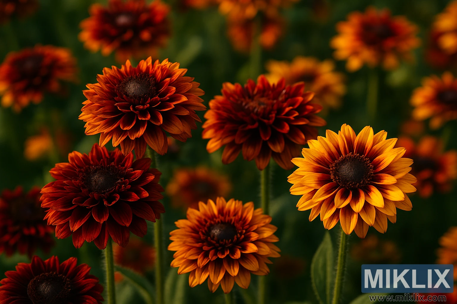 This high-resolution, landscape photograph presents a sumptuous close-up of Rudbeckia ‘Cherokee Sunset’, a beloved cultivar famed for its dramatic, sunset-toned petals and plush, double blooms. The frame is densely populated with flowers at varying depths, creating a tapestry of rich mahogany, wine red, ember orange, and honeyed yellow. Sunlight from a high summer sky pours across the scene, warming the palette and coaxing out the soft sheen of each petal. The closest blossoms are rendered with pin-sharp clarity: layered ray florets stack like satin ribbons around a dusky, domed center, giving the flowers a full, almost chrysanthemum-like silhouette. Each petal narrows to a gentle point, the margins faintly ruffled, the surfaces streaked with fine striations that catch the light differently along their length.