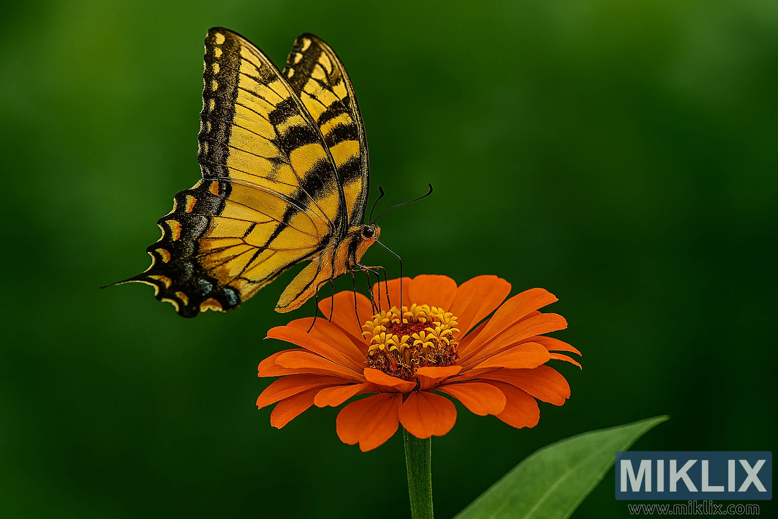 A stunning summer moment is captured in this high-resolution landscape photograph, where an Eastern Tiger Swallowtail butterfly delicately rests atop a vibrant orange zinnia flower. The image is a celebration of color, texture, and natural harmony, set against a softly blurred backdrop of lush green foliage that stretches across the horizontal frame.