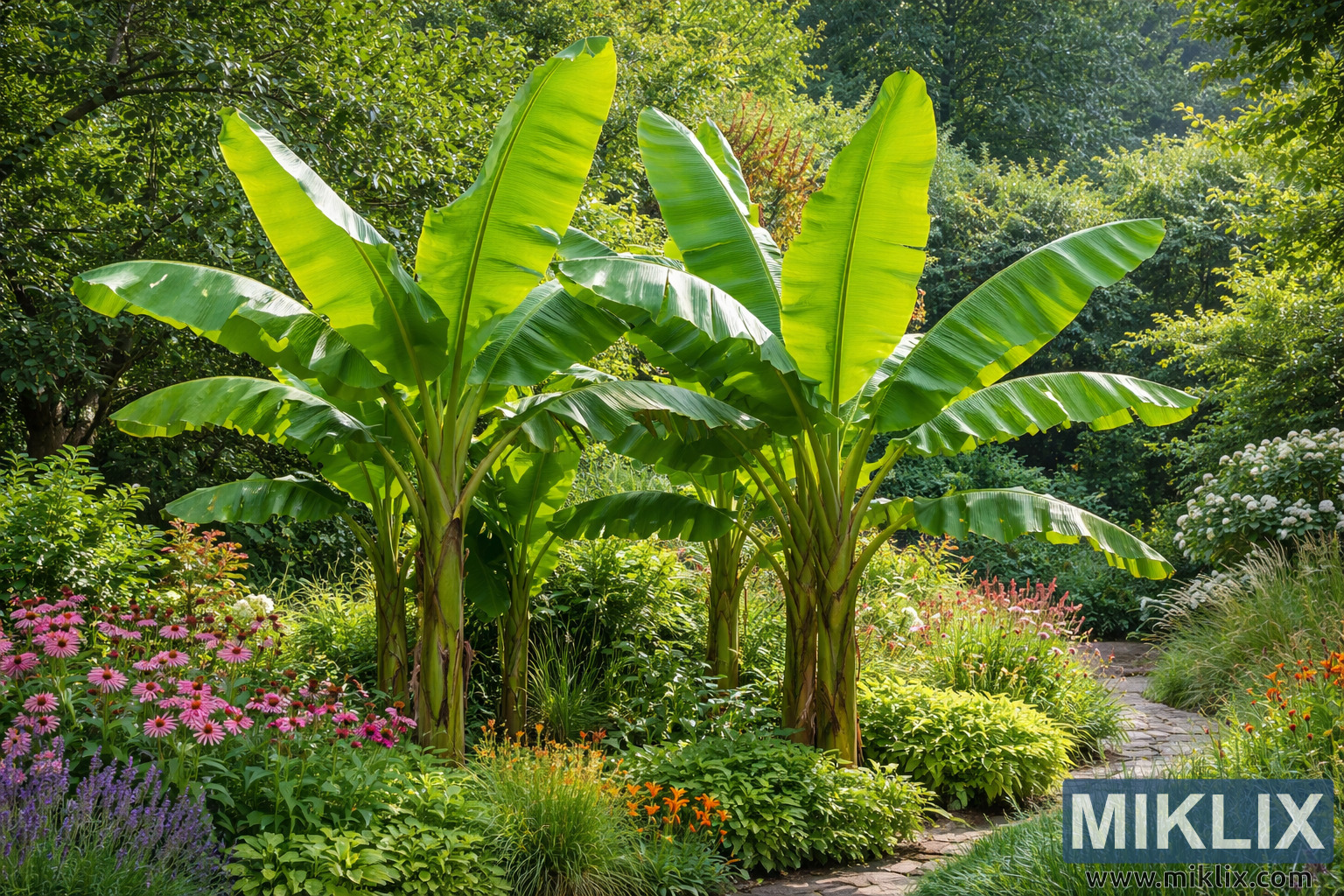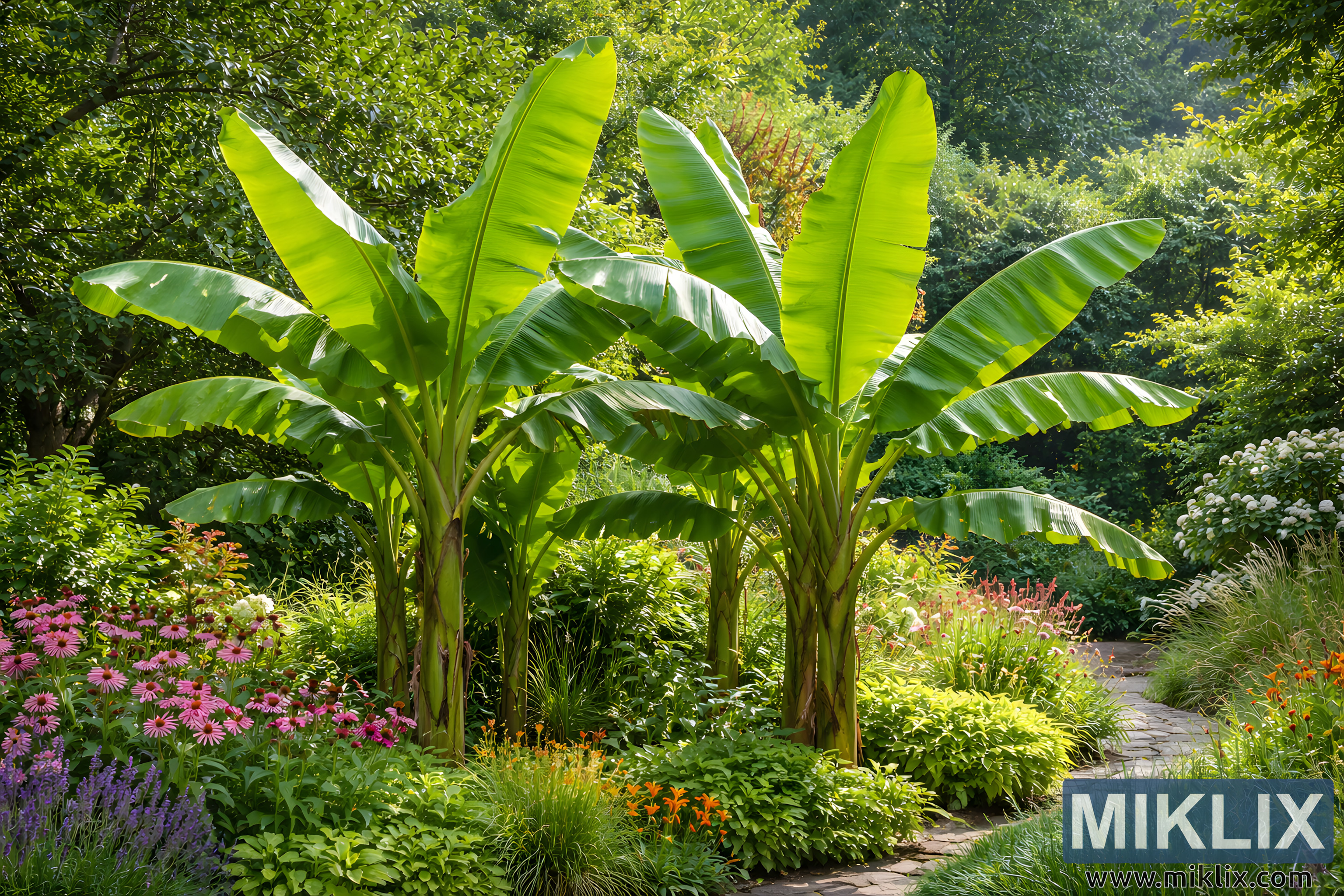 High-resolution image of Musa basjoo banana plants thriving in a temperate garden, surrounded by lush foliage, colorful perennials, and dappled summer sunlight