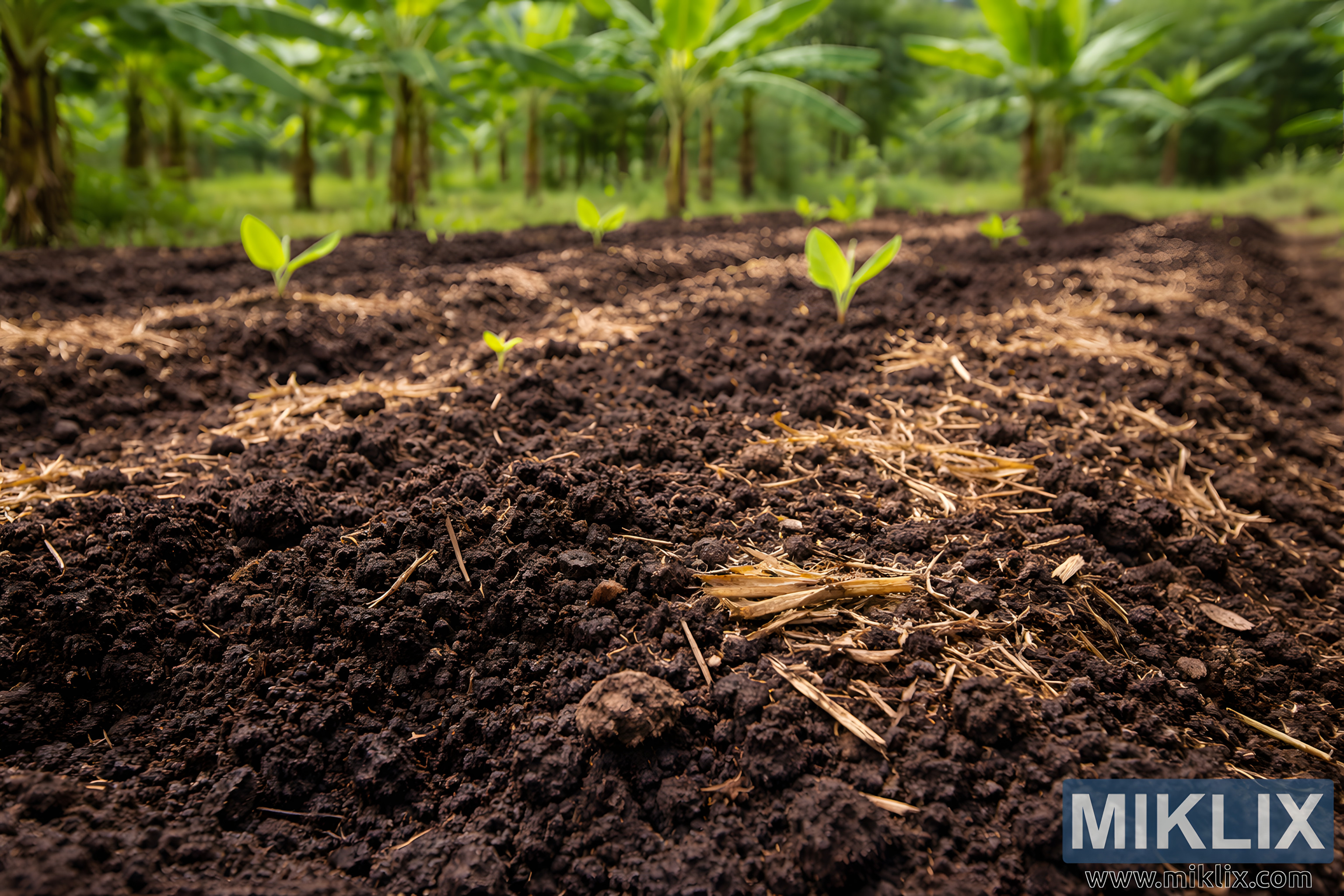 High-resolution landscape image showing nutrient-rich, dark organic soil prepared for banana planting, featuring young banana seedlings and a lush plantation background.