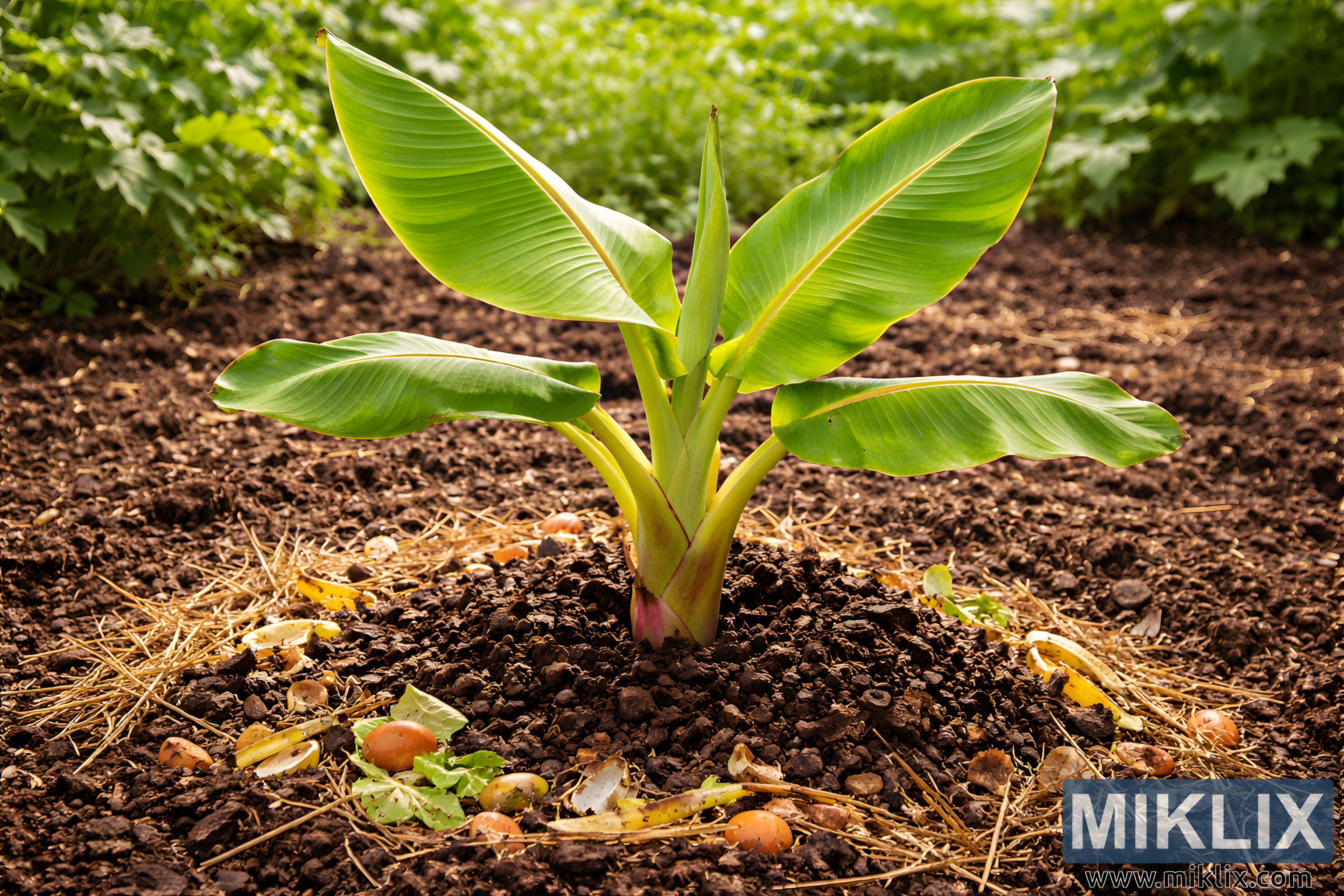 High-resolution photo of a young banana plant thriving in well-mulched soil enriched with organic compost, illustrating healthy growth and sustainable gardening.