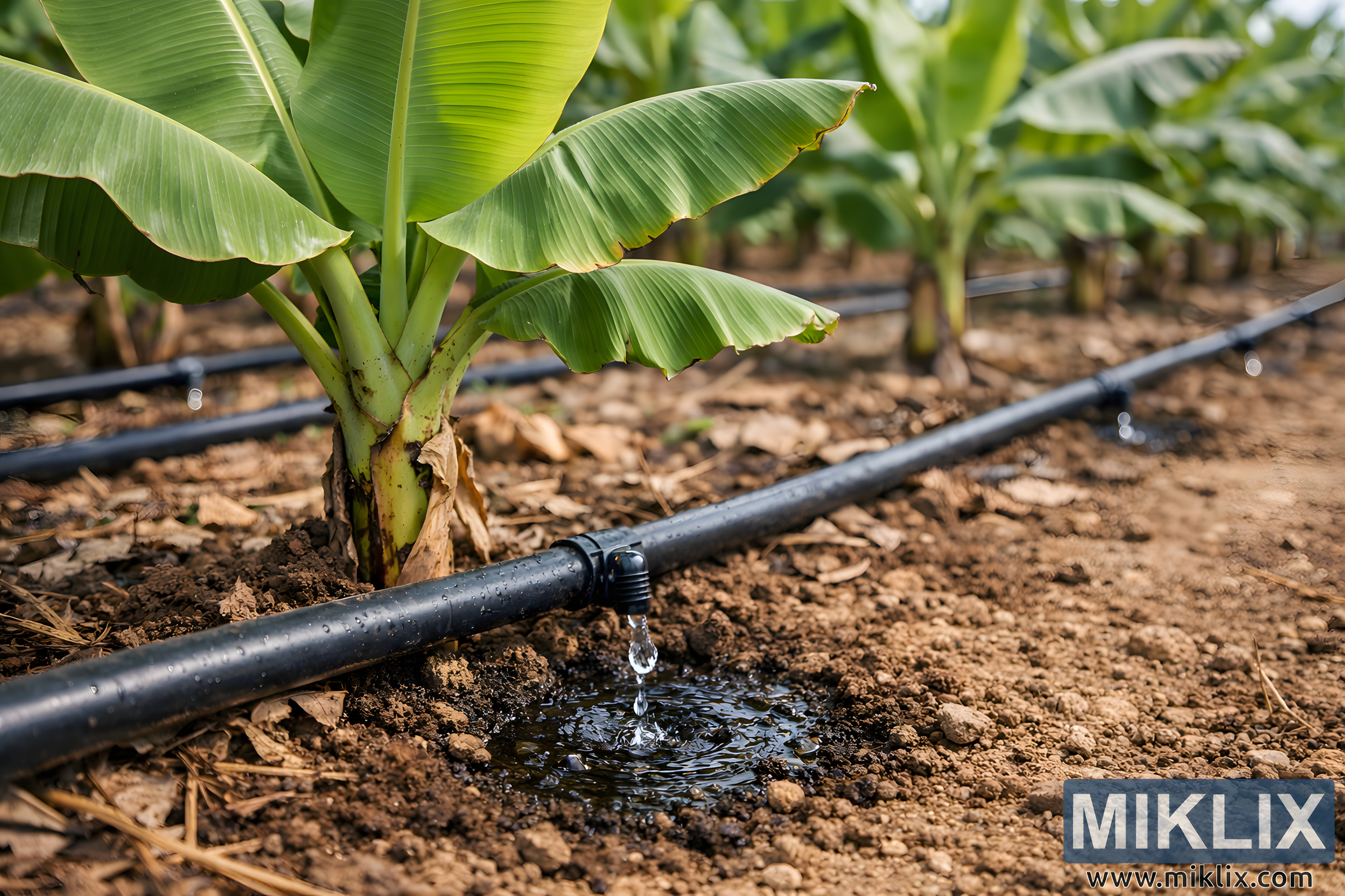Landscape photo of a banana plantation demonstrating proper watering using drip irrigation, with water dripping from an emitter at the base of a healthy banana plant to show efficient, sustainable irrigation practice.