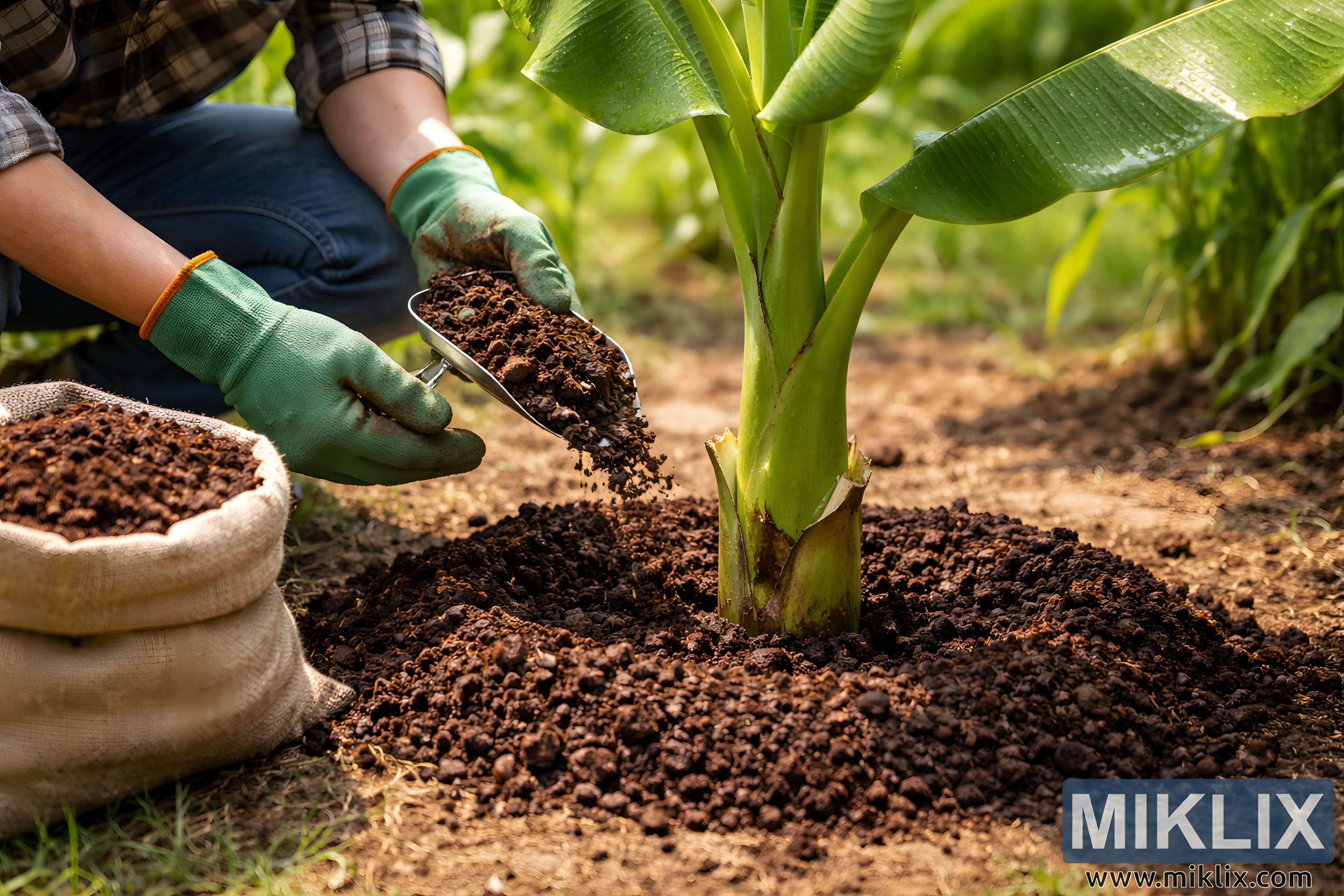 A detailed agricultural scene showing organic fertilizer being carefully applied around the base of a banana plant, highlighting sustainable farming practices.