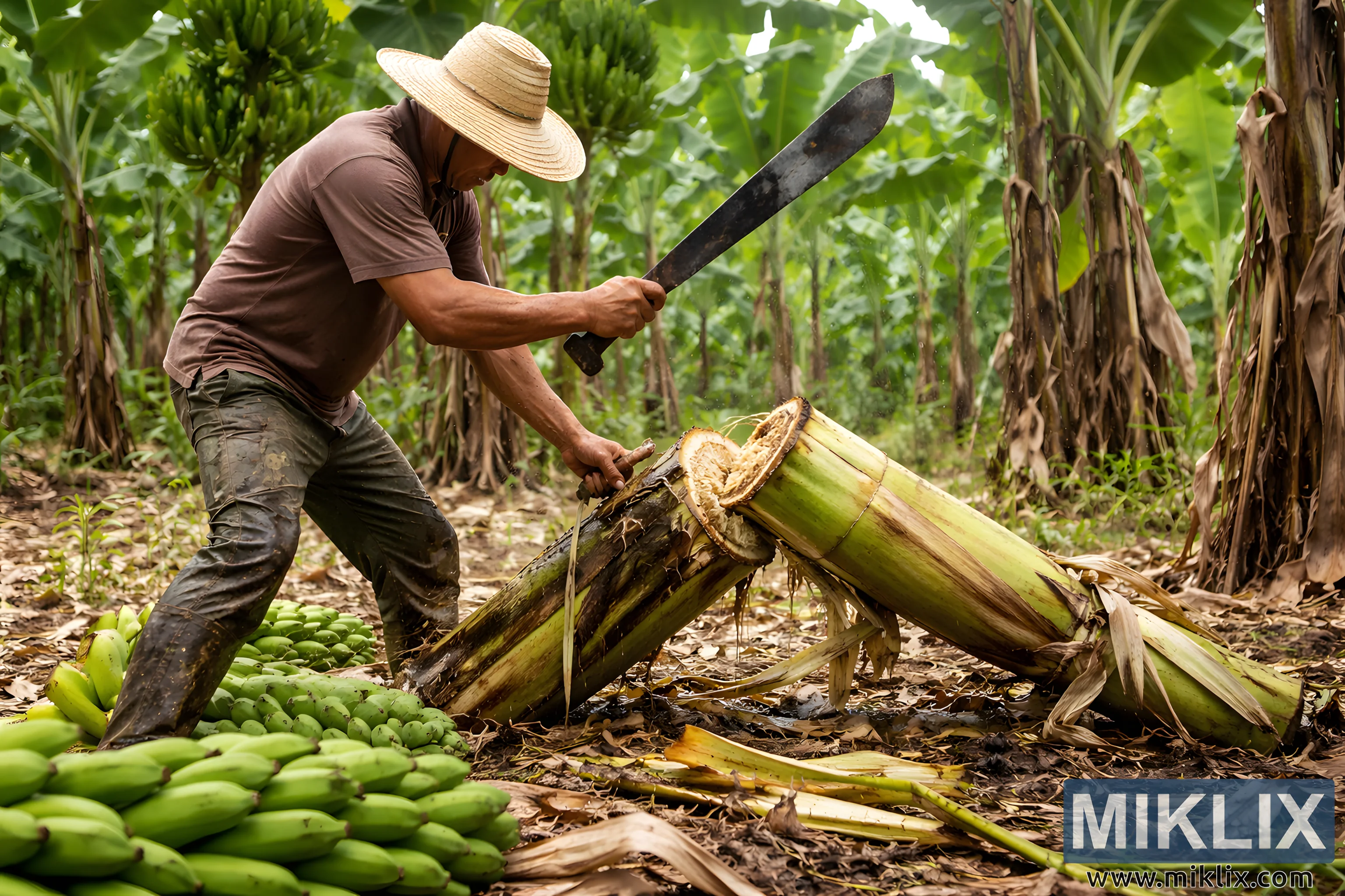 The image depicts a vivid agricultural moment inside a banana plantation, captured in a realistic, documentary-style photograph. In the foreground, a farmer is in the act of cutting down a banana pseudostem after harvest. He is positioned slightly left of center, leaning forward with a focused, deliberate posture that conveys physical effort and experience. The farmer wears a wide-brimmed straw hat that shades his face, a short-sleeved brown shirt, and well-worn, mud-stained trousers suitable for fieldwork. His muscular arms are tensed as he grips a long machete, raised at an angle and mid-swing, emphasizing the dynamic action of chopping through the thick, fibrous pseudostem. The banana pseudostem, already partially severed, lies diagonally across the ground. Its outer layers are green with streaks of brown and yellow, while the freshly cut interior reveals pale, moist fibers, highlighting the plant’s fleshy, water-rich structure. Fragments of cut plant material and strips of peeled bark are scattered around the base, indicating that the harvest process is ongoing or recently completed. In the lower left foreground, several compact bunches of unripe green bananas rest directly on the soil, neatly clustered and contrasting with the rough textures of the ground and plant debris. These bananas suggest a successful harvest and provide visual context for the agricultural task being performed. The ground itself is uneven and earthy, covered with dried banana leaves, stems, and organic matter that form a natural mulch typical of banana plantations. In the background, rows of banana plants extend into the distance, creating a repeating pattern of tall pseudostems and large, lush green leaves. Some leaves are fresh and vibrant, while others are dry and brown, hanging downward and emphasizing the cycle of growth and decay inherent in farming. The dense foliage frames the farmer and draws the viewer’s eye deeper into the plantation, giving a sense of scale and continuity. The lighting appears to be natural daylight, possibly late morning or early afternoon, with soft but clear illumination. Shadows are present but not harsh, allowing fine details—such as the texture of the pseudostem, the soil, and the farmer’s clothing—to remain visible. Overall, the image conveys themes of manual labor, sustainable agriculture, and rural life. It documents a common yet essential step in banana cultivation: removing the spent pseudostem after fruiting to allow new shoots to grow. The scene feels authentic, grounded, and instructive, offering insight into traditional farming practices and the physical relationship between farmer, crop, and land.