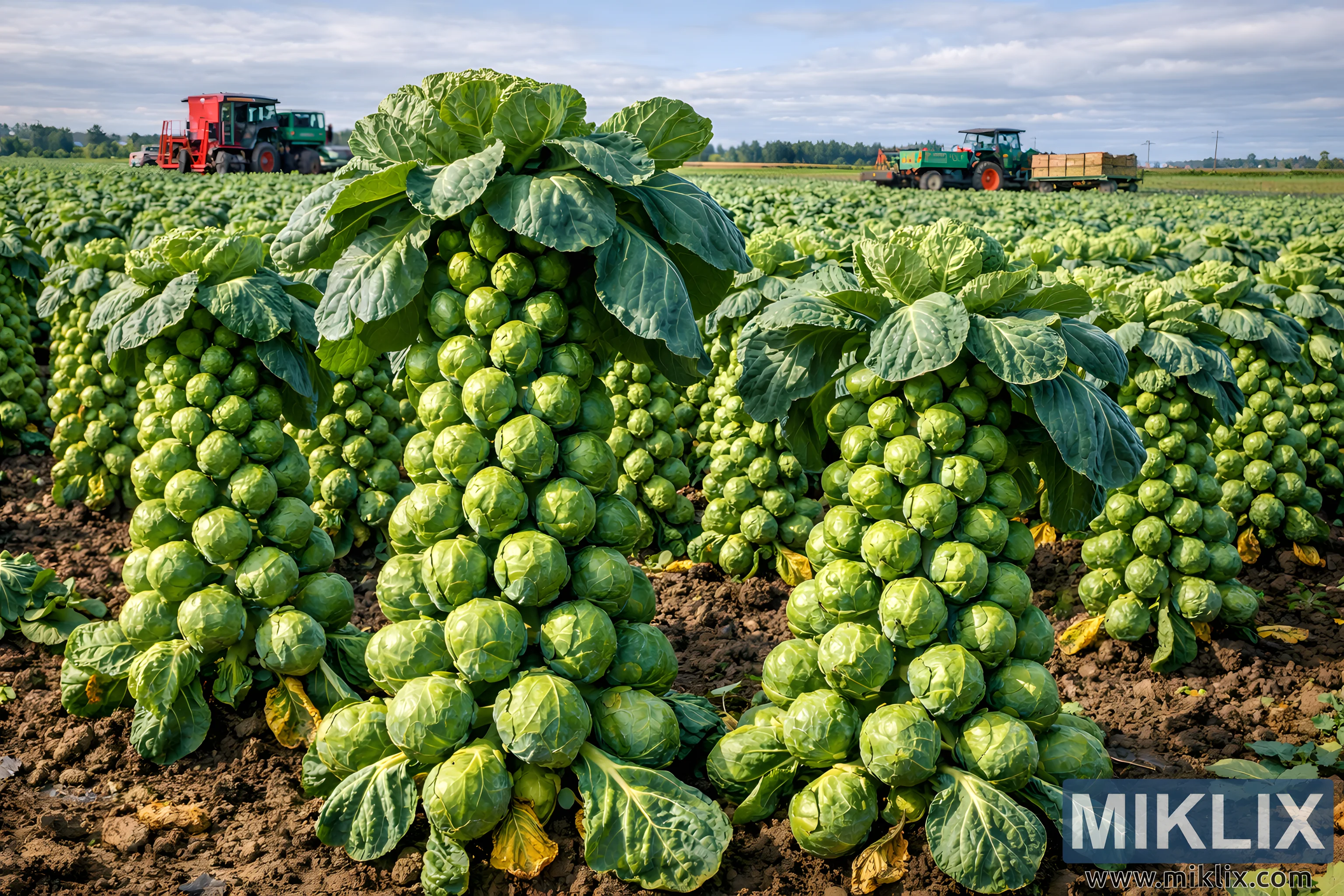 As the eye moves deeper into the image, the orderly rows of Diablo Brussels sprouts extend far into the distance, reinforcing the impression of large-scale commercial production and consistent crop performance. The repetition of evenly spaced plants highlights uniform growth and strong yield potential across the entire field. In the midground, agricultural machinery and harvest equipment are visible, along with a few workers, subtly indicating active or recent harvesting operations without distracting from the crop itself. These elements provide context for industrial-scale farming and emphasize productivity and efficiency.