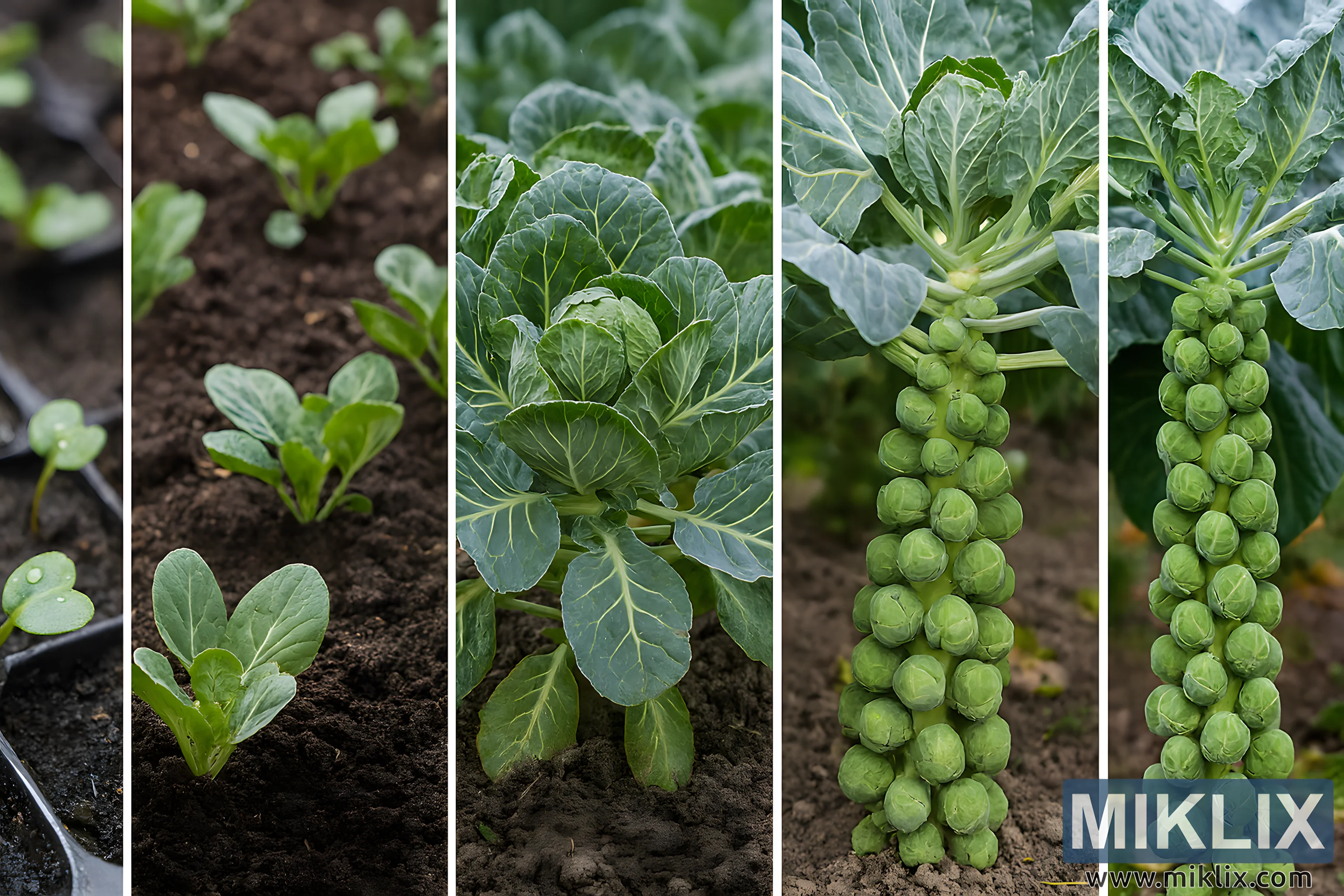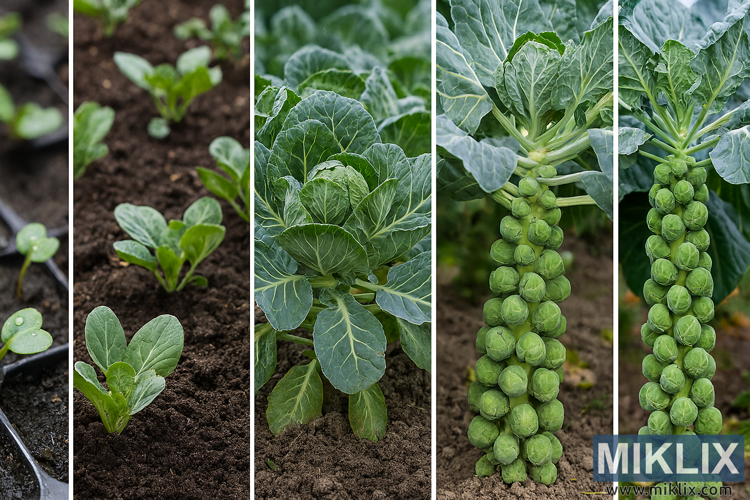 Explore the full growth cycle of Brussels sprouts in this high-resolution collage, from seedlings to harvest-ready stalks.