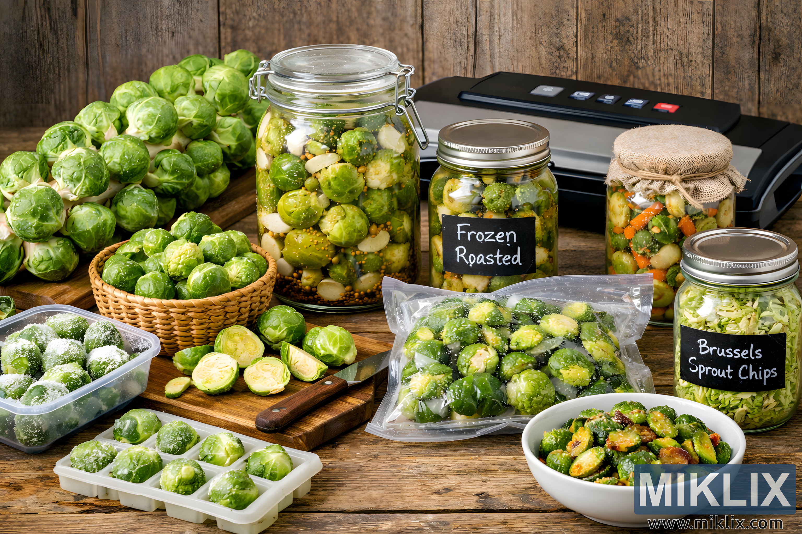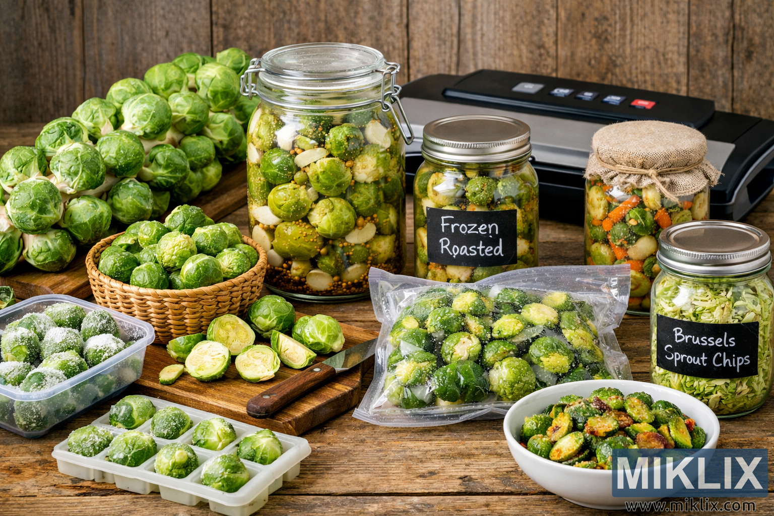 A detailed visual overview of different methods for storing and preserving Brussels sprouts, including fresh storage, freezing, pickling, roasting, drying, canning, and vacuum sealing, arranged on a rustic wooden surface.