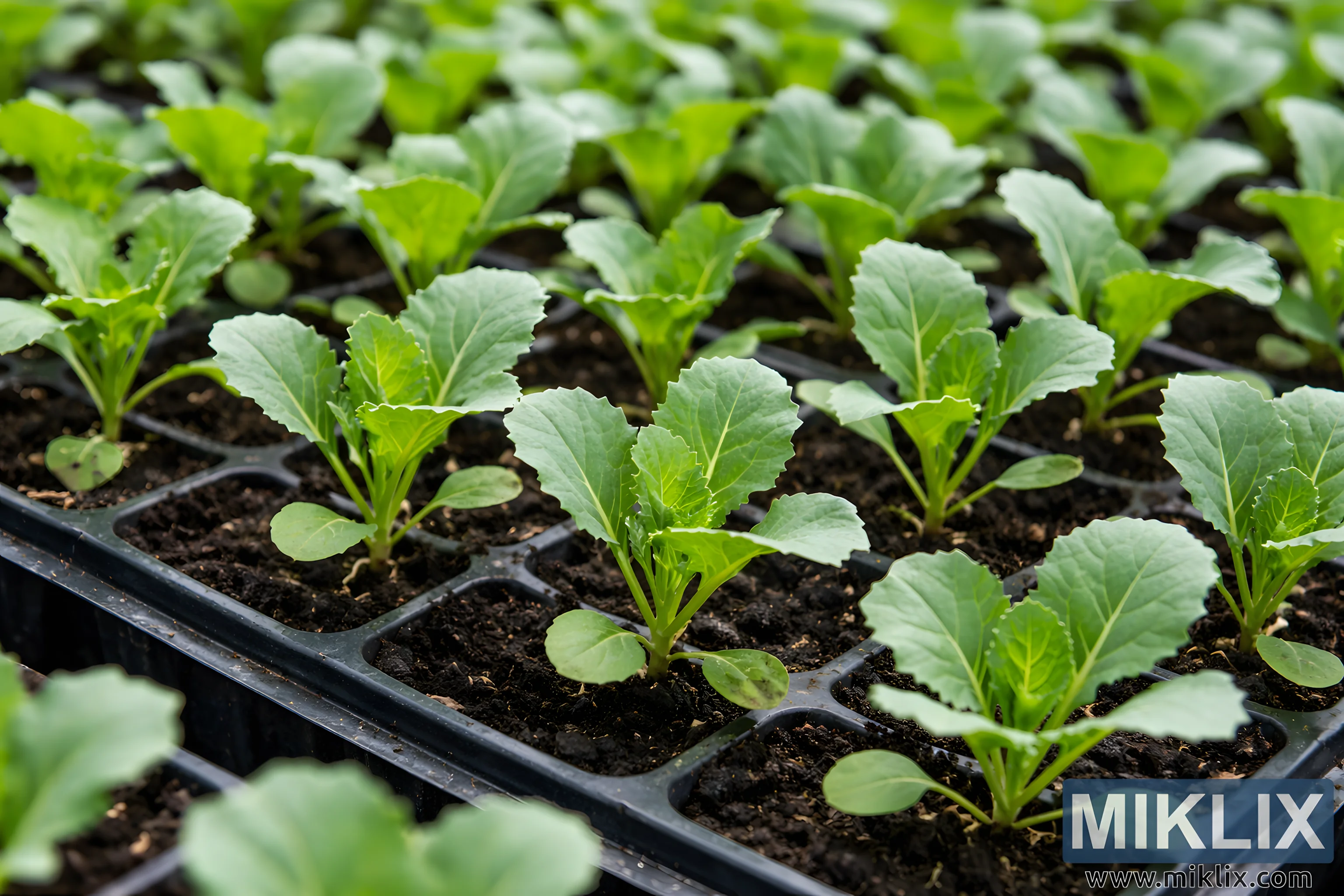 Landscape photo of healthy cauliflower seedlings in seed trays, showing uniform growth, green true leaves, and well-maintained potting soil in a propagation setting