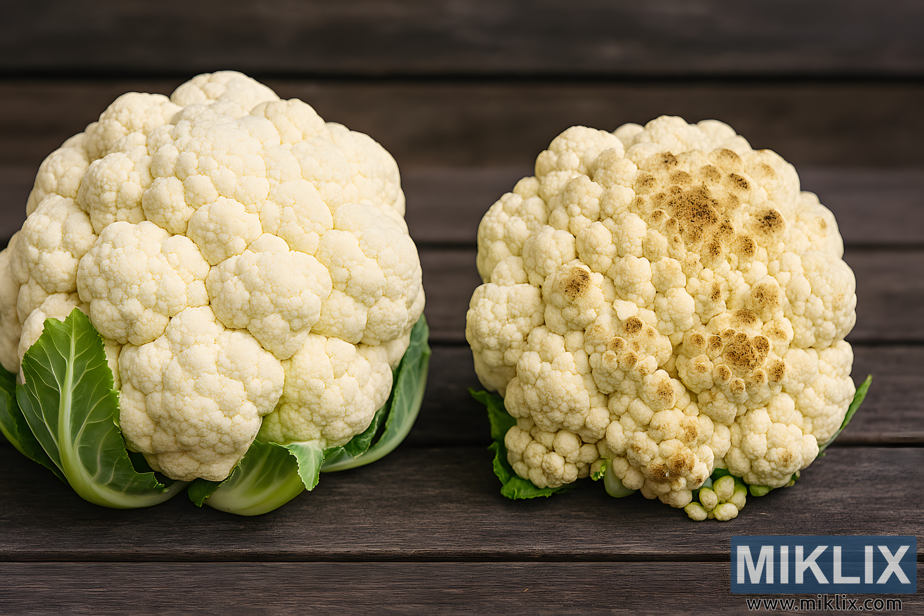High-resolution landscape image showing a healthy cauliflower head next to one with common defects like browning and buttoning, ideal for educational and horticultural use.