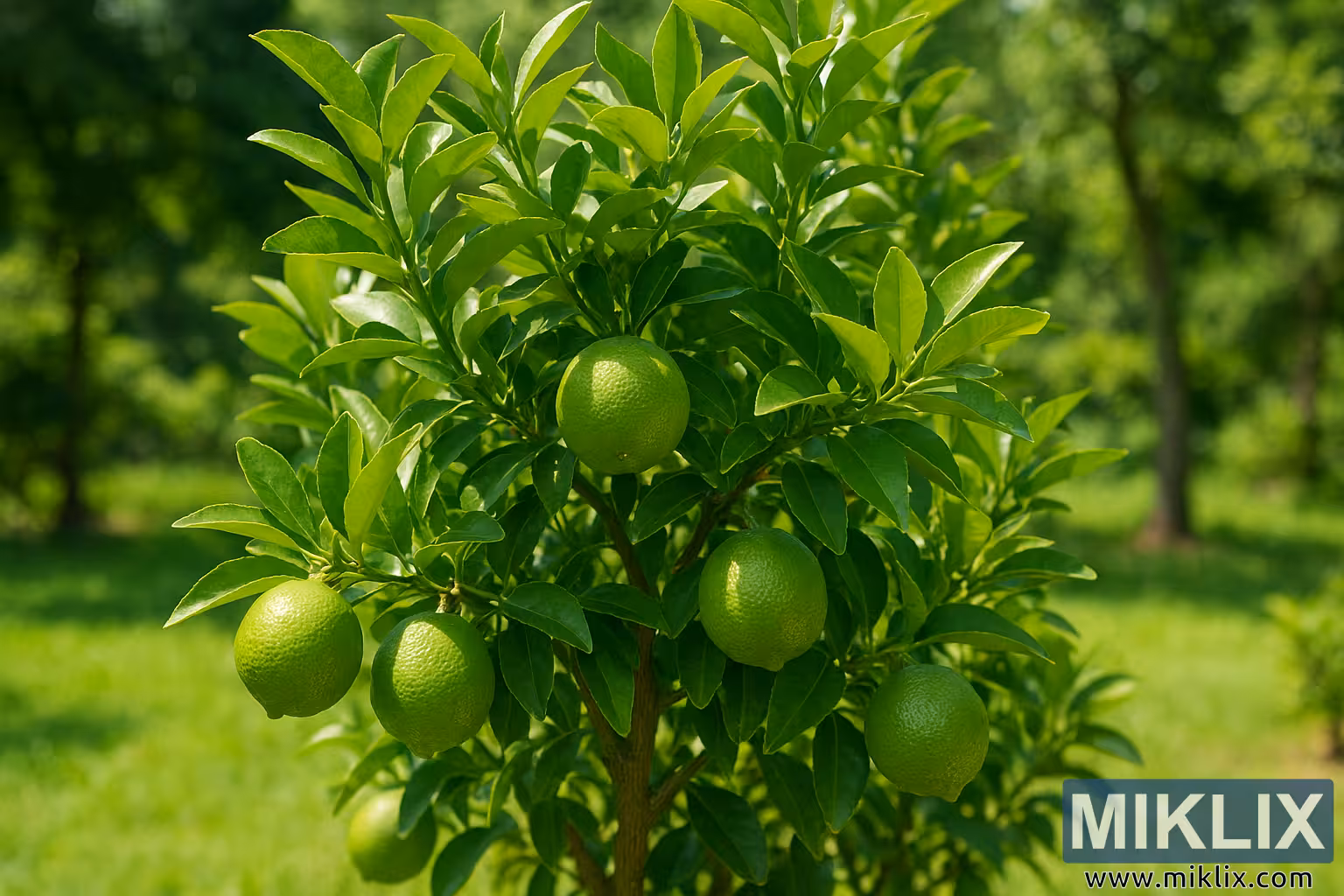 High-resolution image of a healthy lime tree with ripening fruit in a vibrant, sunlit garden.