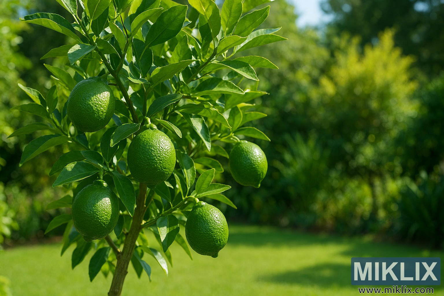 The image’s composition balances botanical detail with environmental context, making it ideal for educational, culinary, or promotional use. The crisp focus on the lime tree and its fruit, combined with the soft garden backdrop, creates a visually engaging and realistic portrayal of citrus cultivation in a home garden setting.
