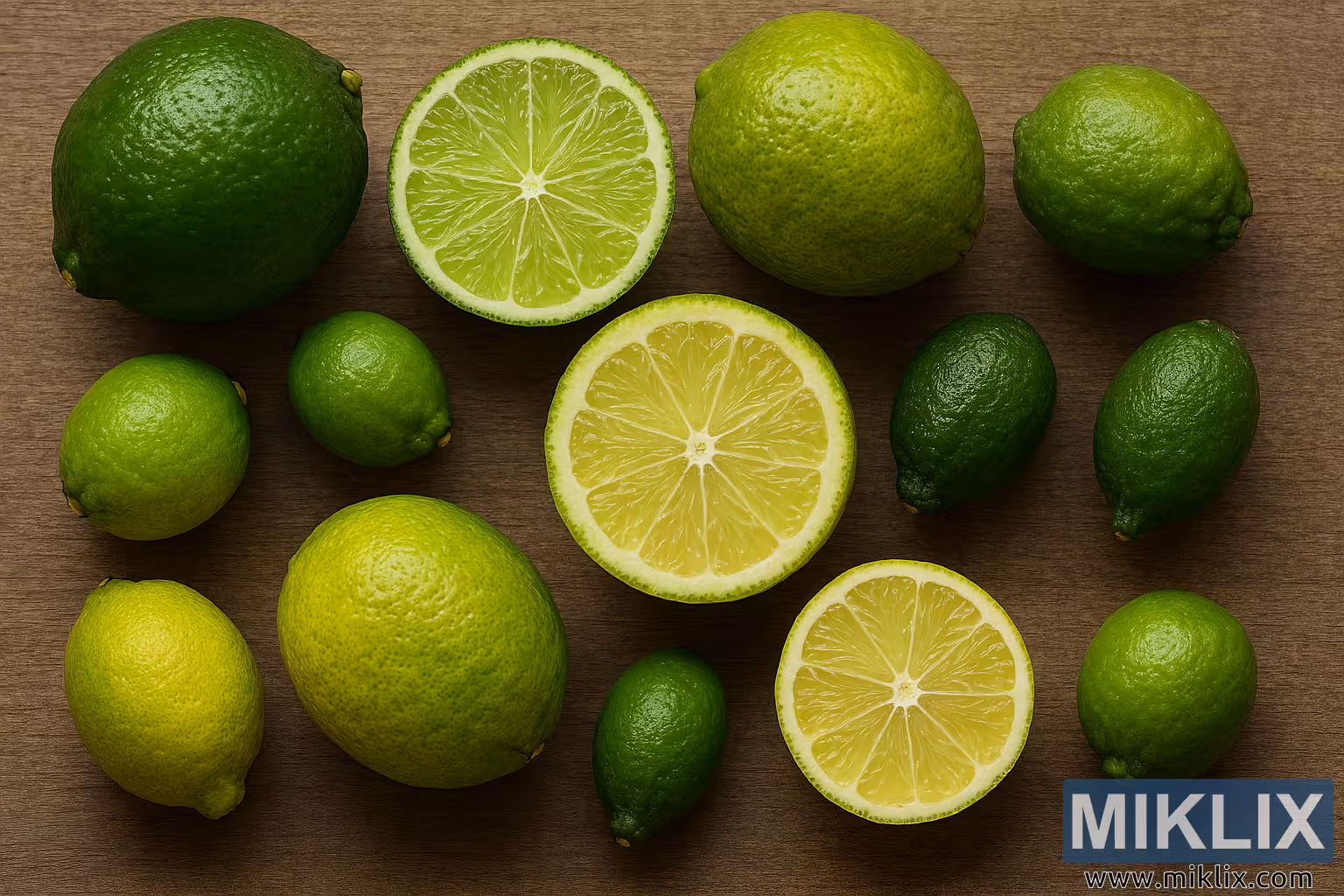 This high-resolution landscape photograph presents a visually rich assortment of lime fruits arranged on a warm-toned wooden surface with subtle horizontal grain. The composition showcases a diverse range of lime varieties, emphasizing differences in size, shape, skin texture, and color—from deep green to yellow-green—capturing both whole and halved specimens in natural lighting.