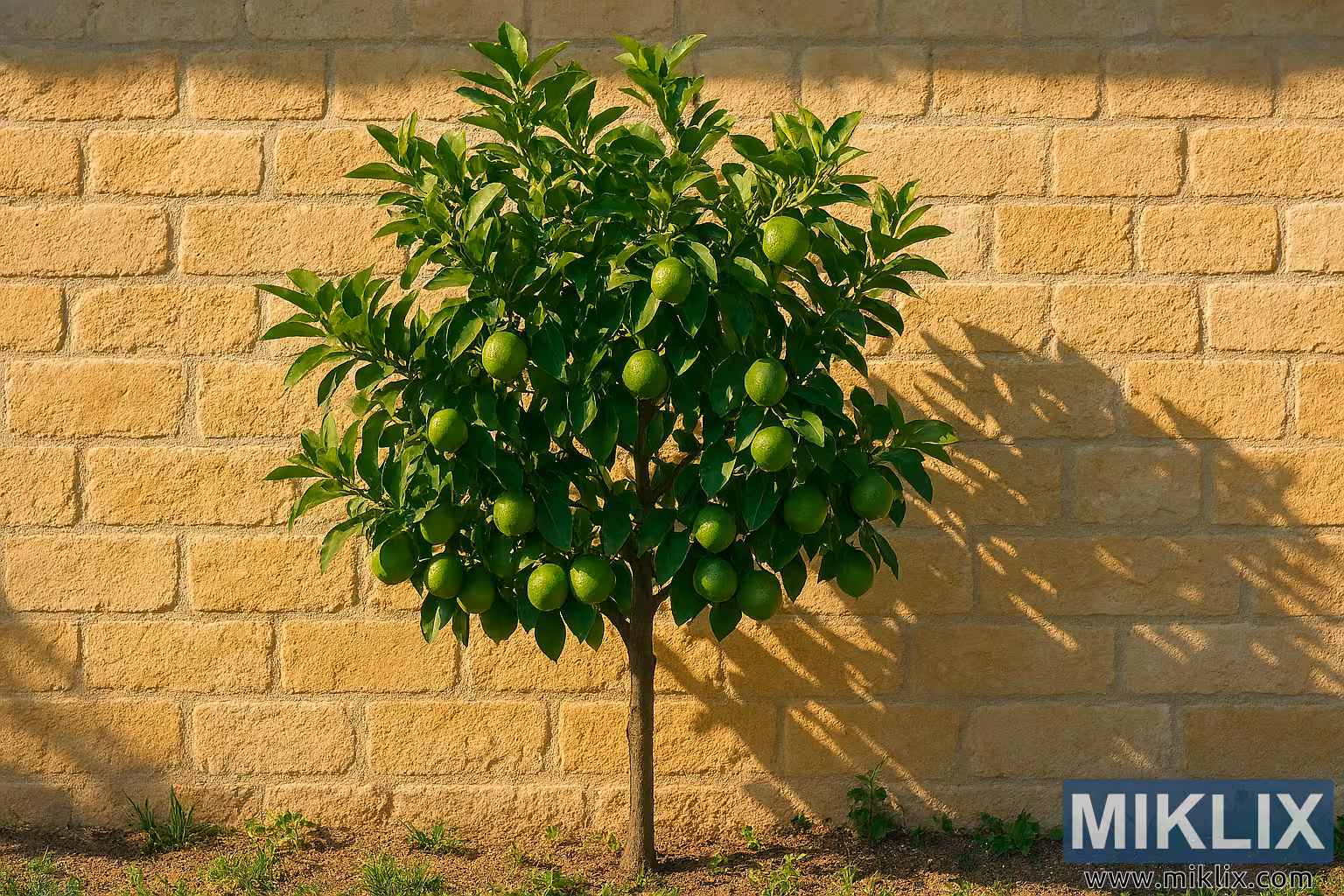 A vibrant lime tree flourishes in full sun against a warm south-facing wall, showcasing lush foliage and ripening fruit in an ideal garden setting.