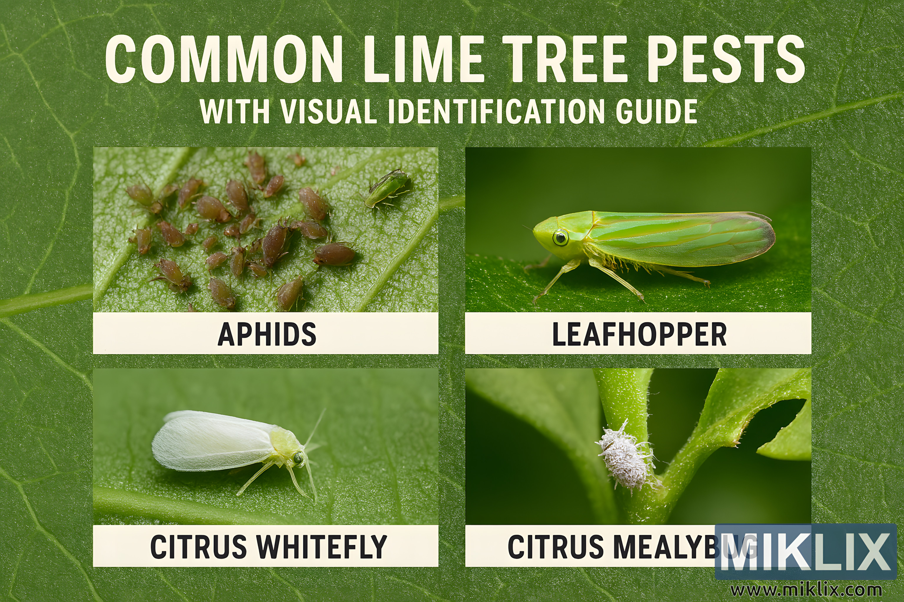 This landscape‑oriented, high‑resolution educational image provides a detailed visual guide to four of the most common pests affecting lime trees. The scene is set outdoors with soft, natural lighting that highlights the textures of the leaves, stems, and pests. The background consists of healthy lime foliage rendered with botanical accuracy, including visible veins, subtle gloss, and natural color gradients ranging from bright lime green to deeper forest tones. The composition is divided into four zones, each dedicated to a specific pest, with clean, unobtrusive labels placed near each subject for quick identification.