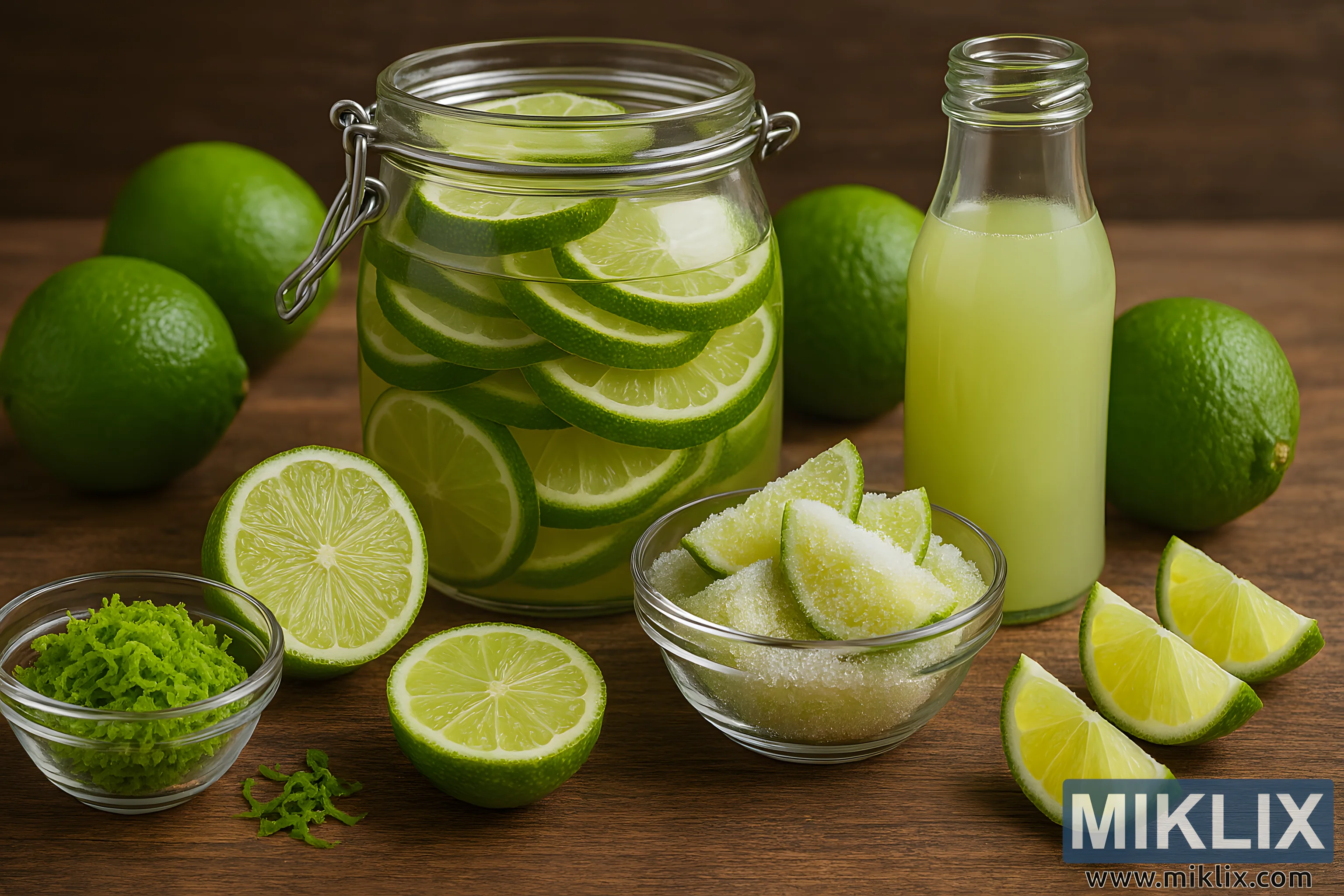 High-resolution image showcasing lime fruits prepared for storage using drying, pickling, canning, and freezing methods on a rustic wooden surface.