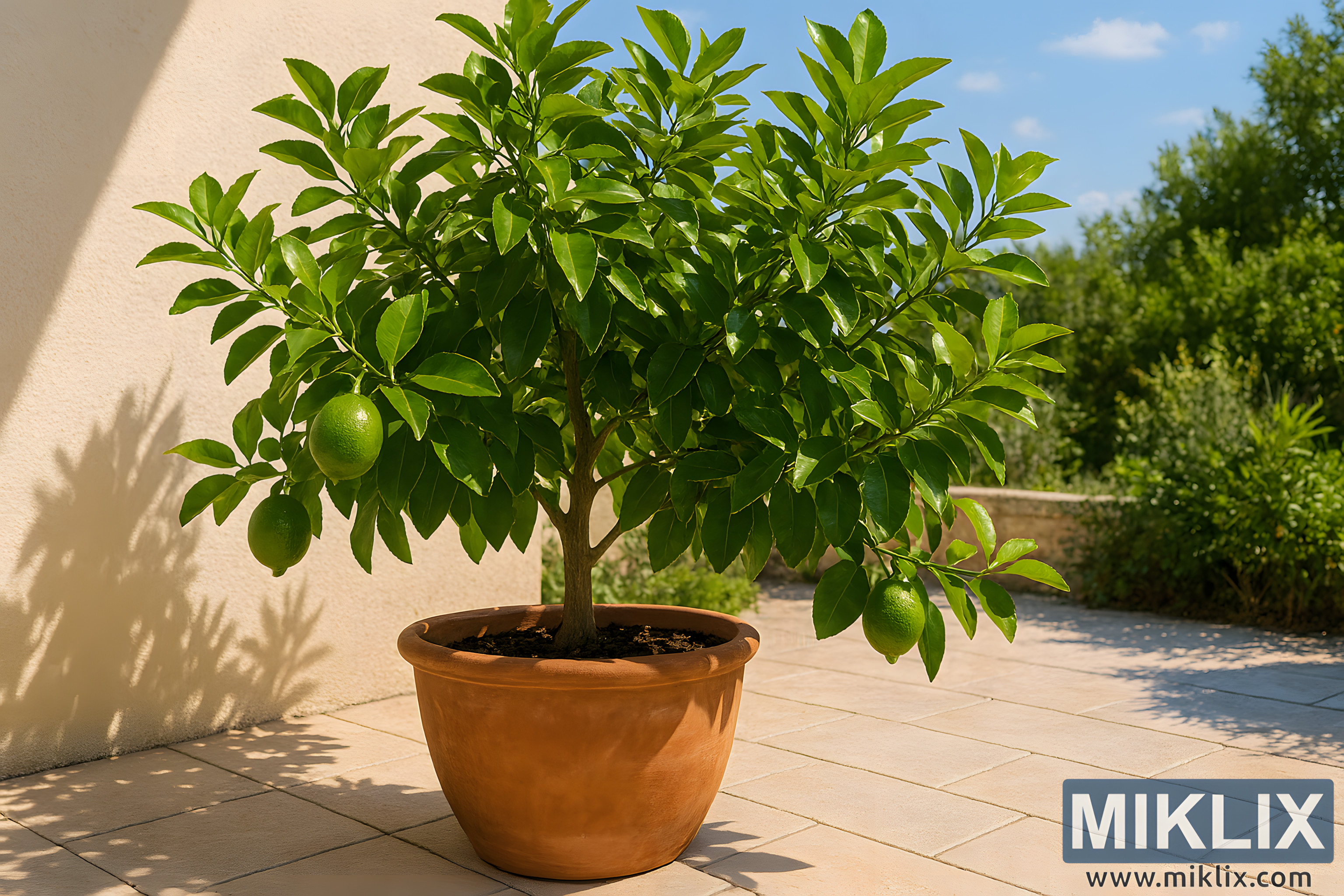 A lush lime tree thrives in a large terracotta container on a bright patio, surrounded by greenery and bathed in warm sunlight.