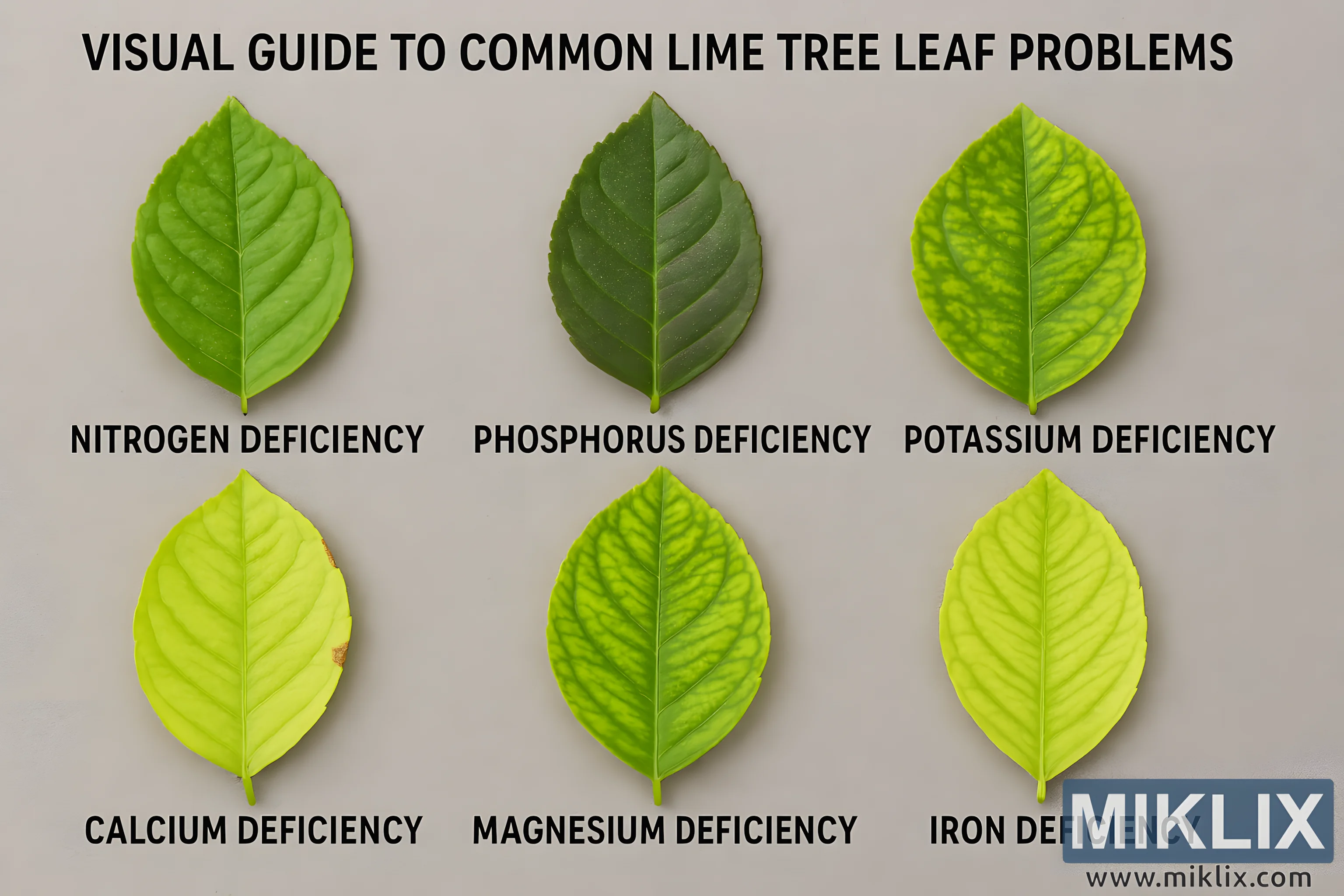 High-resolution visual guide to common lime tree leaf problems, illustrating nutrient deficiencies with labeled leaf examples for educational and horticultural use.