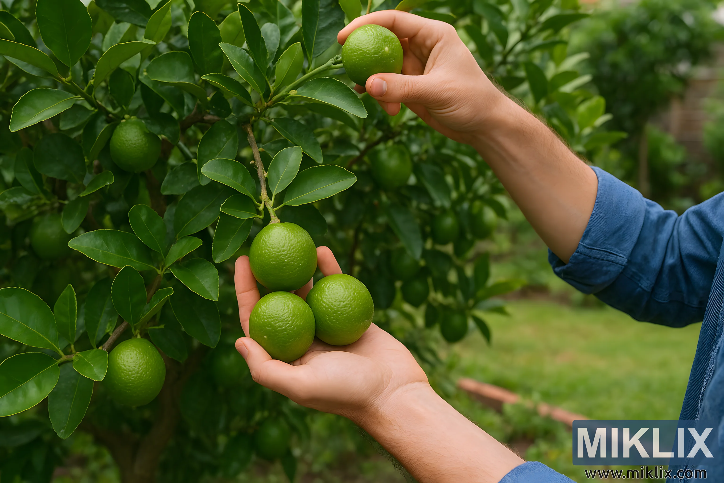 The composition is carefully balanced, with the hands and limes slightly off-center to draw the viewer’s eye naturally across the frame. The image captures a moment of quiet productivity and connection to nature, evoking themes of sustainability, homegrown produce, and the simple pleasures of gardening. The realism and clarity of the photograph make it ideal for educational, culinary, or promotional use, offering a vivid portrayal of lime harvesting in a domestic setting.