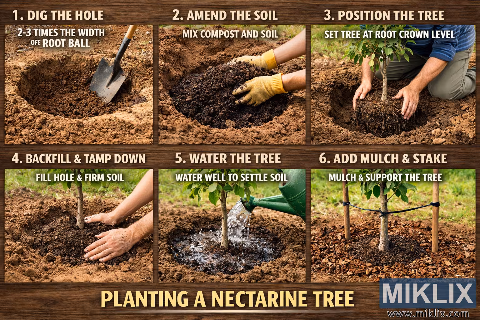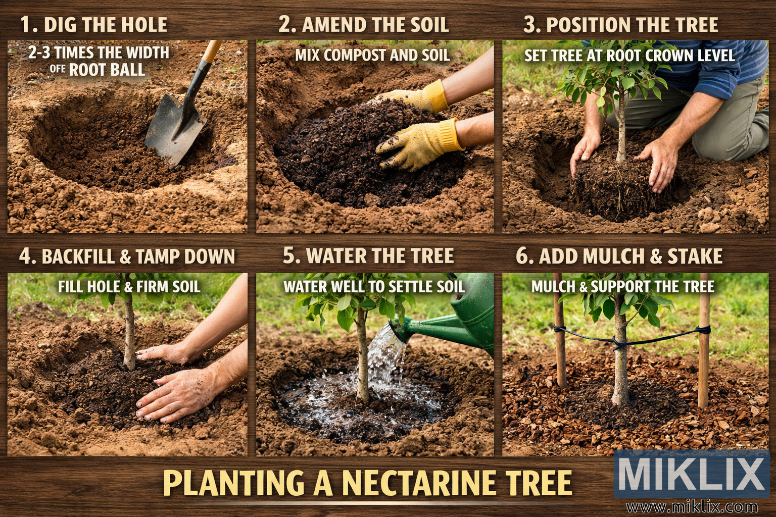 Illustrated step-by-step photo guide showing proper depth and technique for planting a nectarine tree, including soil preparation, watering, mulching, and staking.