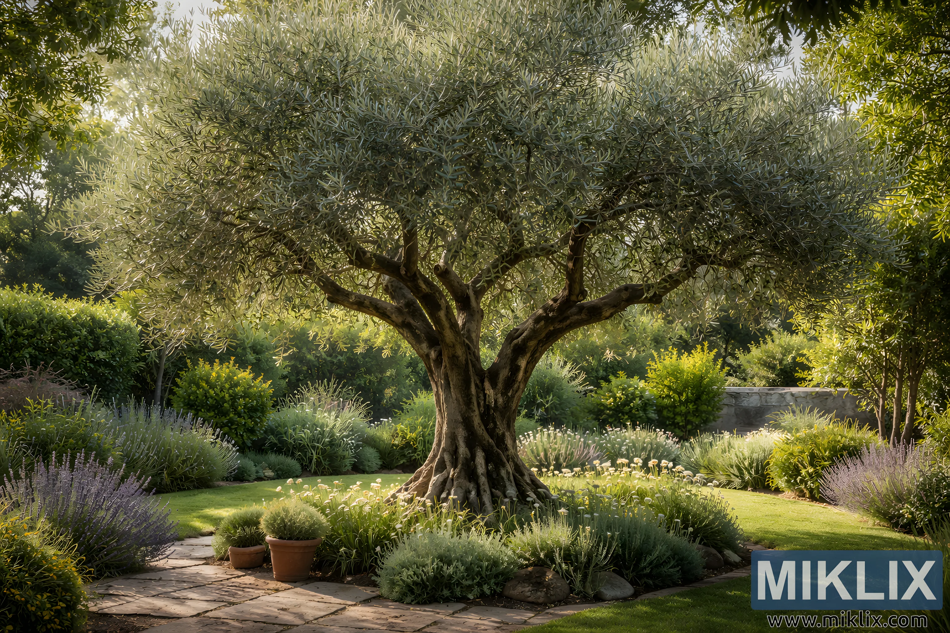 High-resolution image of a mature olive tree with silvery-green leaves and a sculptural trunk, set in a peaceful home garden with Mediterranean plants and warm natural light